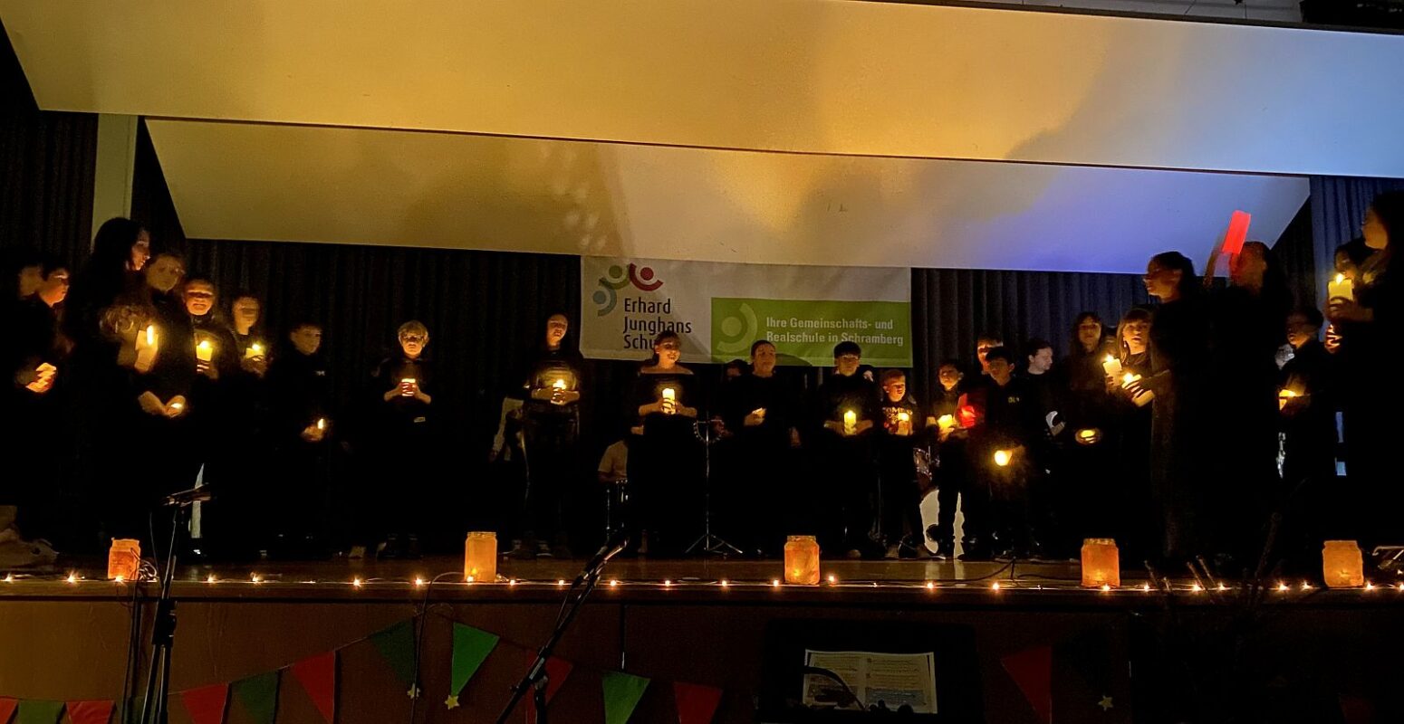 Die Adventsfeier der Klassen 5 bis 7 der Erhard-Junghans-Schule war ein festlicher Höhepunkt des Jahres. Sie fand in der Aula des benachbarten Gymnasiums statt. Die Erhard-Junghans-Schule habe in beiden ihren Gebäuden leider keine passende Räumlichkeit für eine Feier in dieser Größenordnung, so die Schule in einer Pressemitteilung.