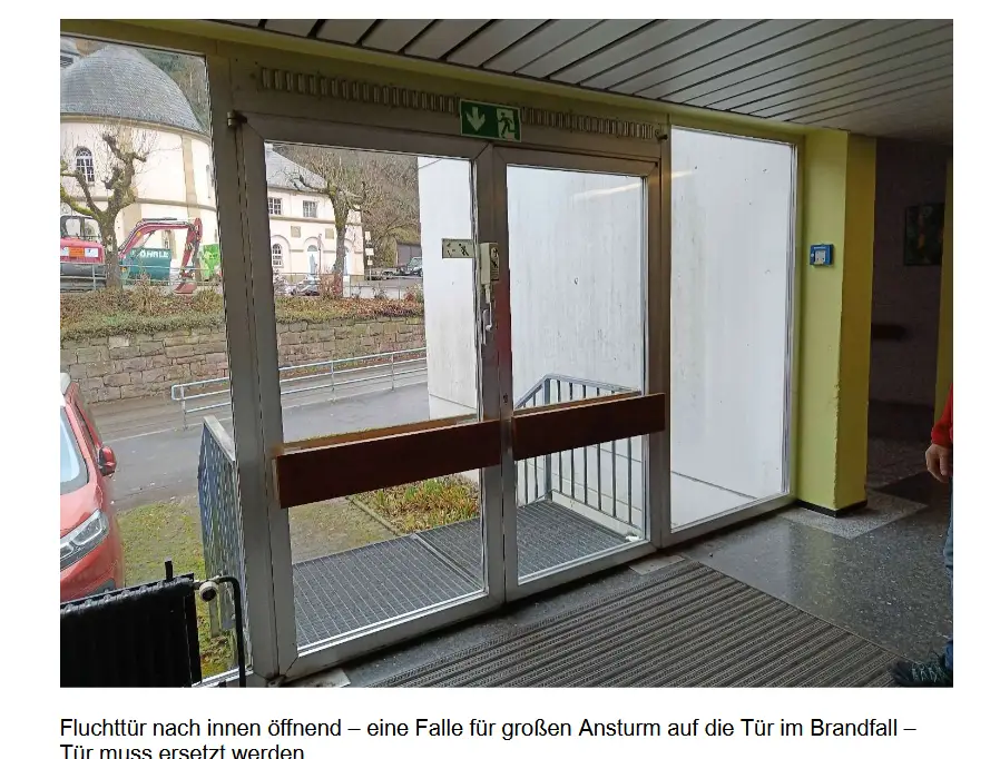 Er nannte defekte oder, falsch, nämlich nach innen, aufschlagende Brandschutztüren, ungesicherte Fluchtwege, Rauchtüren, die nicht dicht abschließen, unzureichende oder fehlende Beschilderung der Flucht- und Rettungswege. An einer Entrauchungsklappe fehlte nach einer Reparatur der erforderliche Elektromotor. Feuerlöscher seien zugestellt gewesen oder waren mangelhaft.