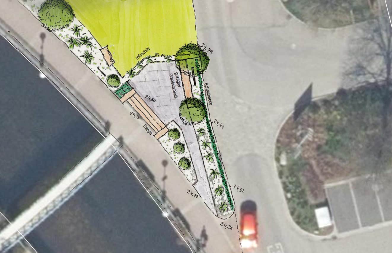 Schramberg. In der Spitze des Dreiecks zwischen Hauptstraße und dem kombinierten Geh- und Radweg entlang der Schiltach sollen zwei Bäumchen Schatten spenden. Dazwischen wird eine Sitzbank aus gesägtem Granit stehen. Eine Reihe von Büschen soll den kleinen Bereich Richtung Hauptstraße abschirmen. Für die Umgestaltung rechnet die Stadt mit 28.000 Euro Kosten.