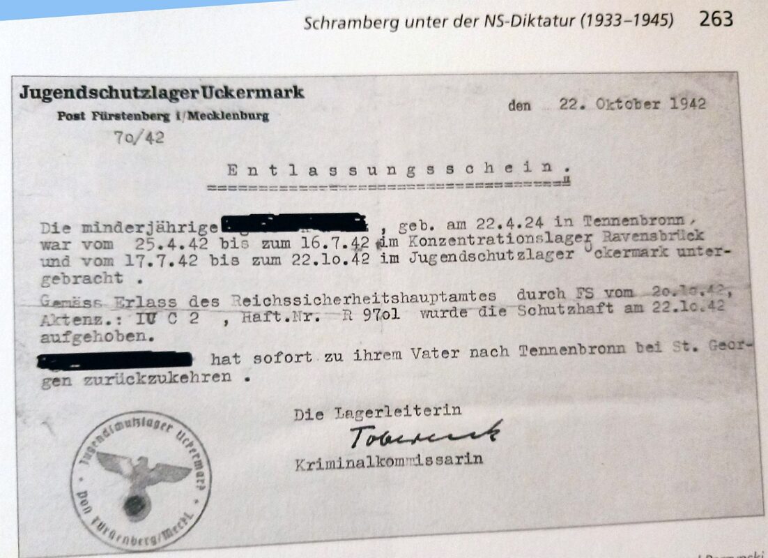 Losch hatte damals den Namen der jungen Frau aus Rücksicht auf noch lebende Personen auf dem Entlassungsdokument des KZs geschwärzt. Ein Versuch, die Gedenktafel zu erneuern, war 2006 ebenfalls aus Rücksicht auf Betroffene gescheitert.