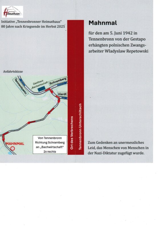 80 Jahre nach Kriegsende, 83 Jahre nach einem furchtbaren Verbrechen der NS- Schergen gedenken der Stadtteil Tennenbronn und die Stadt Schramberg der Opfer: Wladislaw Repetowski, Agnes Kunz und Franz Xaver Kunz. Bei einem Pressegespräch im Schramberger Rathaus hat Stadtarchivar Carsten Kohlmann gemeinsam mit Oberbürgermeisterin Dorothee Eisenlohr und den beiden Vertretern des „Tennenbronner Heimathauses“, Robert Herrmann und Alfred Moosmann, berichtet, was bis heute über das Schicksal der Familie bekannt ist.