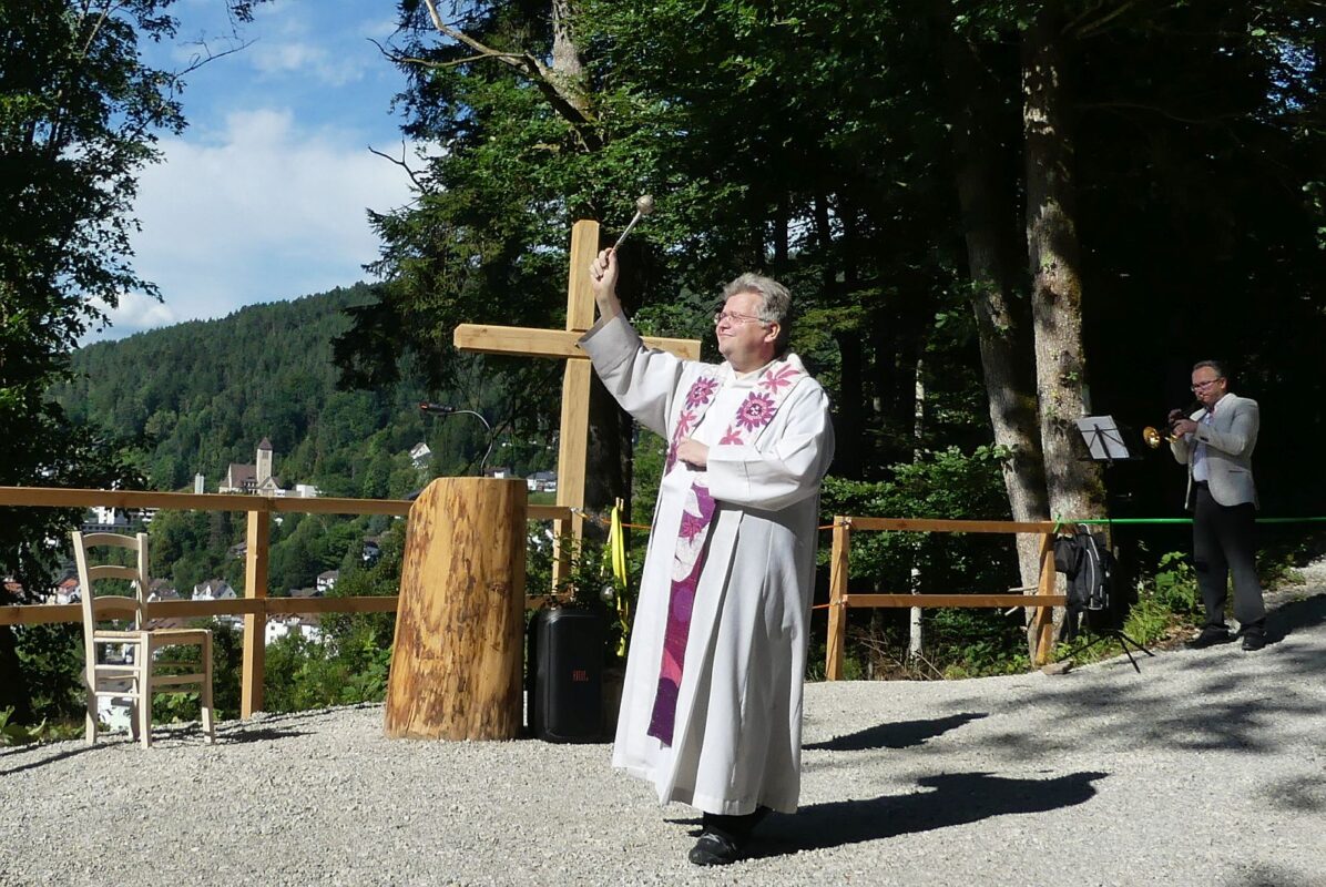 Schramberg. In Anwesenheit des Landrats Wolf-Rüdiger Michel, der Schramberger Oberbürgermeisterin Dorothee Eisenlohr, ihres Vorgängers Thomas Herzog, etlicher aktueller und früherer Gemeinderätinnen und Räte, Mitarbeitern der Stadtverwaltung und Anwohnern weihte Dekan Rüdiger Kocholl den „Falkensteiner Ruh“ genannten Bestattungswald der Familie von Bissingen.
