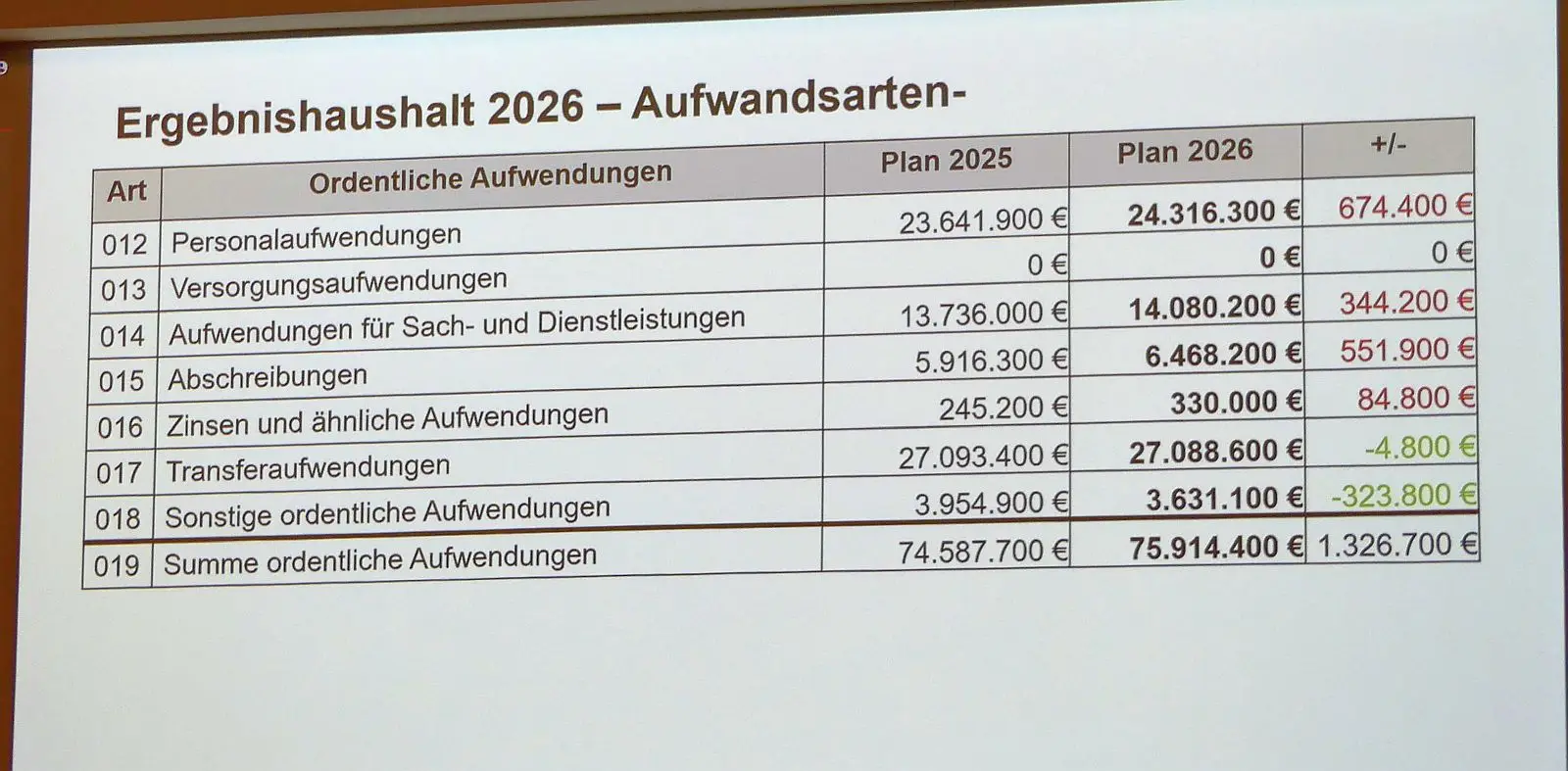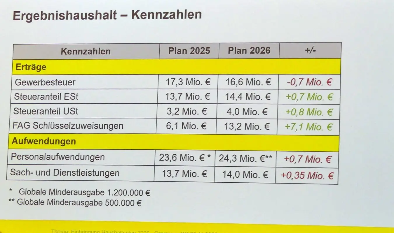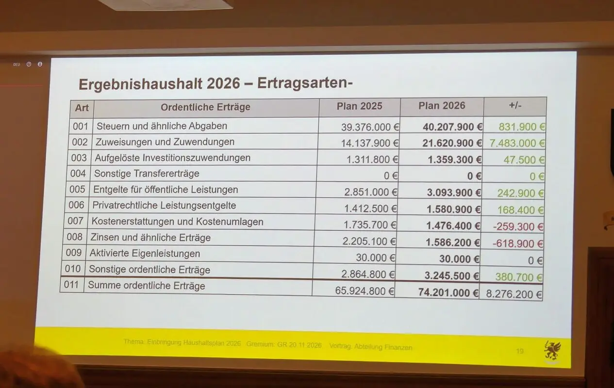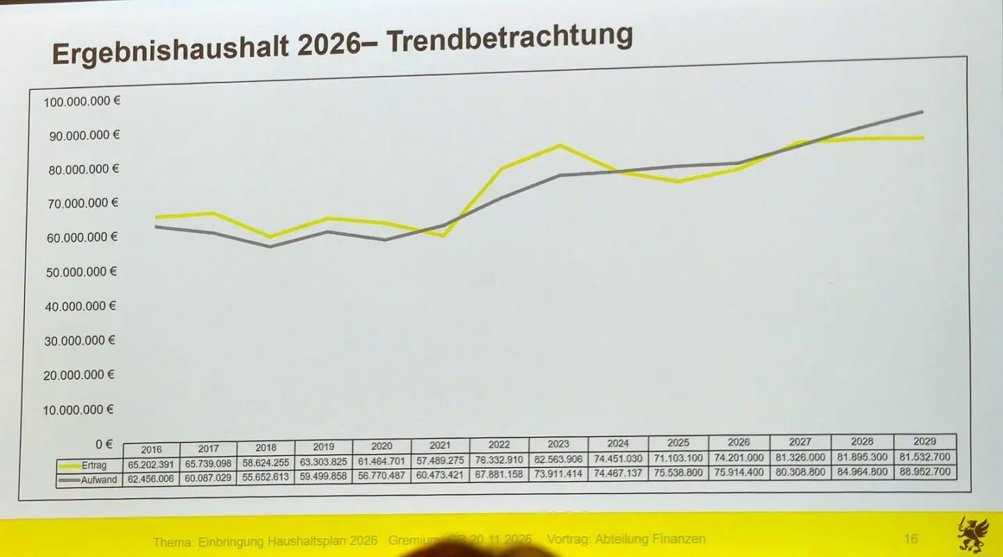Ein erhebliches Minus im Ergebnishaushalt weist der Haushaltsplan 2026 der Stadt Schramberg aus. Aus den 1,7 Millionen Defizit, die noch in der Vorlage von Kämmerer Klemens Walter standen, würden nur noch 800.000 Euro. Die Stadt darf nämlich mit 900.000 Euro mehr aus dem Finanzausgleich rechnen. Dennoch haben die Gemeinderätinnen und Räte im Anschluss an Walters Bericht nach weiteren Einsparmöglichkeiten gesucht, um wenigstens auf eine Null zu kommen. Insgesamt fast 76 Millionen Euro stecken im Ergebnishaushalt.