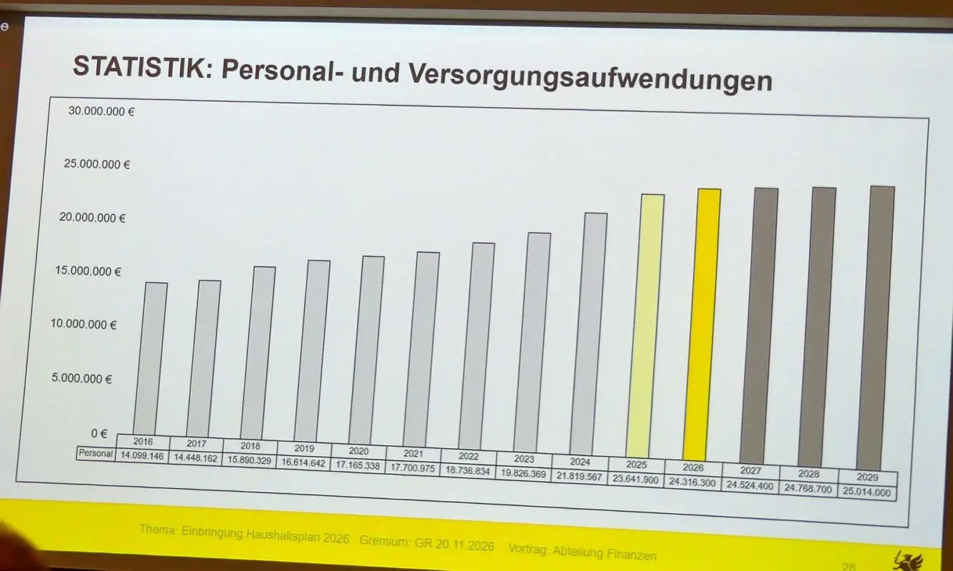 Fachbereichsleiter Christian Birkle erklärte bei den Personalkosten von gut 24 Millionen Euro gehe man von einer globalen Minderausgabe von 500.000 Euro aus. Damit liege man deutlich niedriger als in den Vorjahren. Der Grund: 97 Prozent der Stellen seien besetzt. Das sei der schlechteren Konjunktur geschuldet. Neue Stellen seien nur für die Betreuung im Kita- und Schulbereich beantragt.