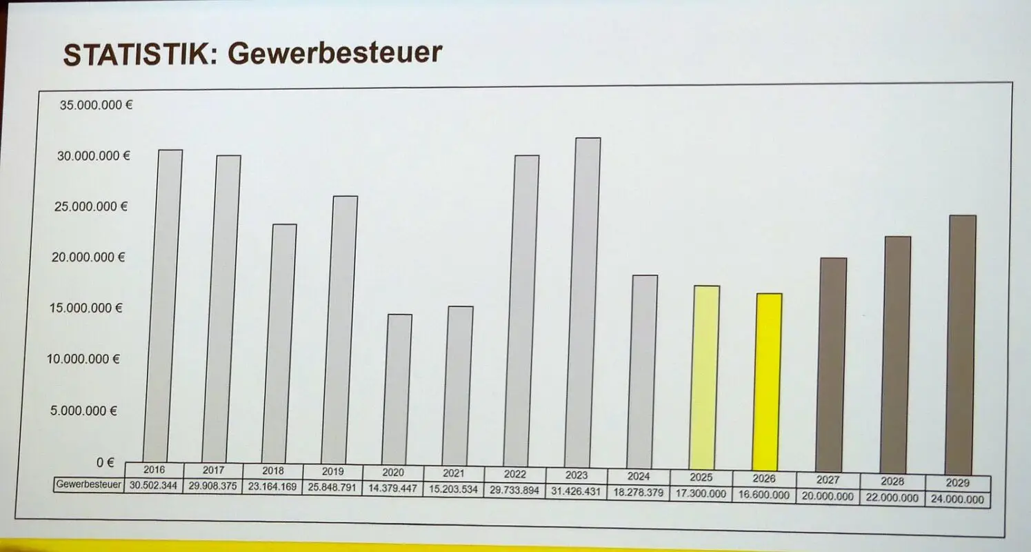 Die beschlossenen Haushaltseinsparungen von 25 Prozent und dann nochmals zehn Prozent könnten „die Mindererträge im Millionenbereich nicht in kurzer Zeit kompensieren“. Bei der Gewerbesteuer rechnet Walter im Jahr 2026 mit 16,6 Millionen, gut 15 Millionen seien Vorauszahlungen. In früheren Jahren nahm Schramberg um die 25 Millionen ein. Deshalb rechnet der Kämmerer mit einem leichten Anstieg in den Folgejahren. „Etwas Optimismus kann man haben.“