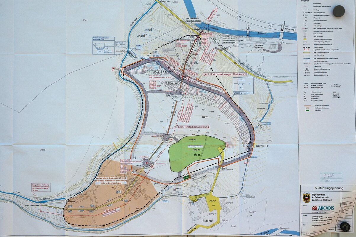 Seit vielen Jahren, ja Jahrzehnten schon muss der Landkreis die ehemalige Schramberger „Stadtmiste“ sanieren. Mit Millionenaufwand hat man um die Jahrtausendwende ein gigantisches Entwässerungssystem in den Deponiekörper eingebaut. 2009 beschloss der Kreistag, weitere 3,5 Millionen Euro für den Ausbau des Drainagesystems einzusetzen. Nochmal etwa 2,5 Millionen sollte dann die Abdeckung kosten.