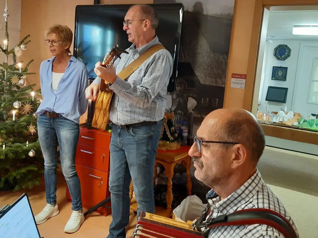 Zur Tradition bei der Weihnachtsausstellung im Heimathaus ist das gemeinsame Singen geworden. Das Trio Birgit, Bob und Manne verstand sich auf eine meisterhafte „Stubenmusik“ – Glühwein, Punsch, Weihnachtsgebäck und Bratäpfel taten ein übriges. So verbrachten etliche Gäste einen kompletten vorweihnachtlichen und stimmungsvollen Nachmittag im Heimathaus.