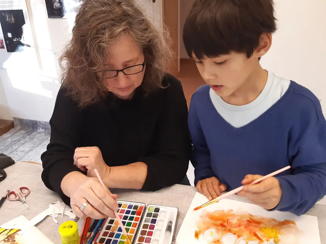 Unter Anleitung von Kerstin Heinlein bestand für die kleinen Besucher der Ausstellung die Möglichkeit, neue Bilder und Figuren zu malen und auszuschneiden. Mit Feuereifer waren die Kinder zugange und es entstanden viele neue kreative Werke.