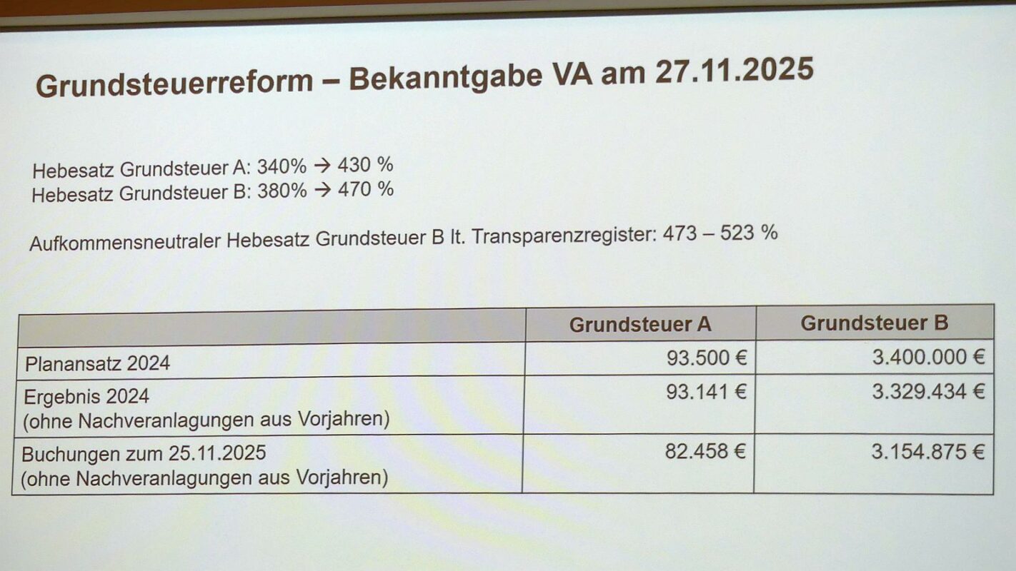 Bei der Grundsteuer A für landwirtschaftliche Flächen habe man 2024 mit 93.500 Euro geplant und 93.131 Euro eingenommen. In diesem Jahr seien bisher etwa 82.500 Euro eingegangen. Bei der Grundsteuer B für Baugebiete lag die Schätzung für 2024 bei 3.4 Millionen Euro geplant und 3,329 Millionen Euro eingenommen, beides ohne Nachveranlagungen. In diesem Jahr, nach der Reform, lägen die Einnahme derzeit bei 3,154 Millionen Euro.