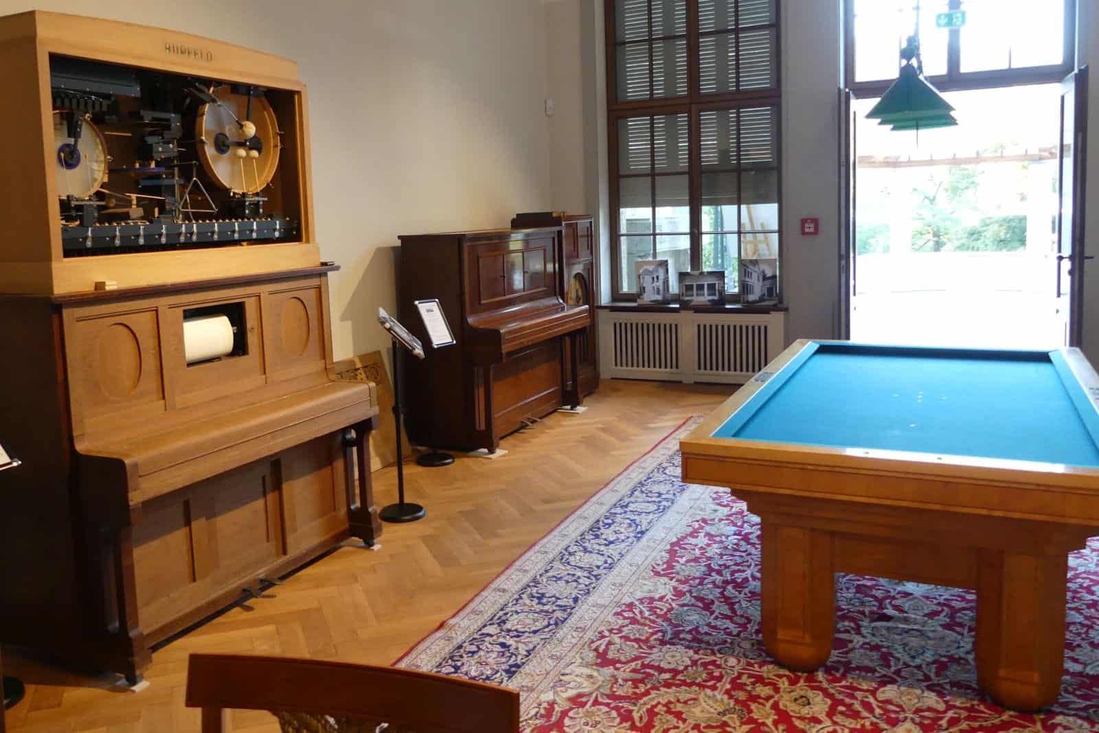 Überall in den Räumen finden sich große und kleinere selbstspielende Musikinstrumente, die Hans-Jochem Steim aus der Sammlung von Wendelin Warner aus Leinfelden-Echterdingen erworben hatte. Alles überragend das „Schiedmaier Scheola Orgel Harmonium“ aus dem Jahr 1920 in der Eingangshalle.