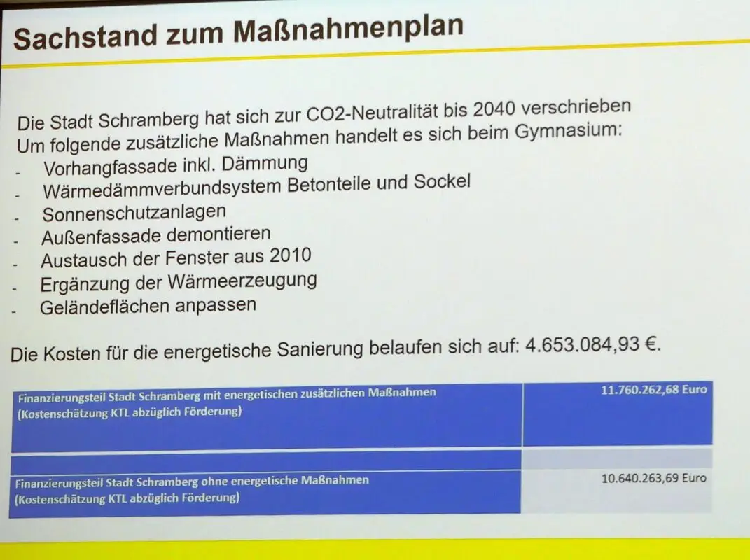Sie warb anschließend dafür, das Gebäude umfassend energetisch sanieren zu lassen. Das würde etwa 4,7 Millionen Euro zusätzlich kosten. Dafür müssten unter anderem die Fassade erneuert und gedämmt, die Fenster aus dem Jahr 2010 ausgetauscht, die Heizung ergänzt und der Sonnenschutz erneuert werden.