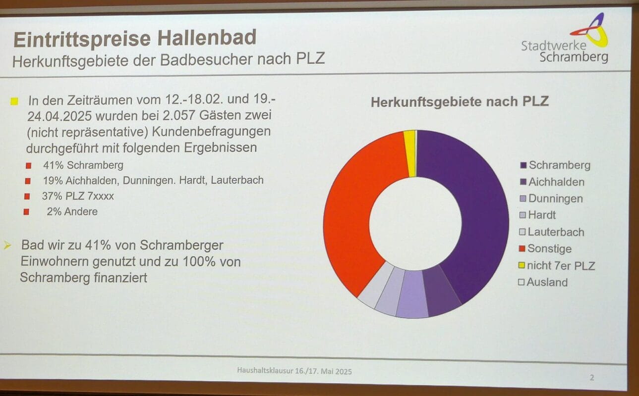 Beim Hallenbad wies Kälble darauf hin, dass laut einer Befragung nur gut 40 Prozent der Badegäste aus Schramberg kommen. Die Mehrheit komme aus dem Umland oder von weiter her. Je Badegast nehme man durchschnittlich 3,29 ein. Die Stadt zahle etwa 15 Euro drauf. Der Kostendeckungsgrad liege bei etwa 20 Prozent.