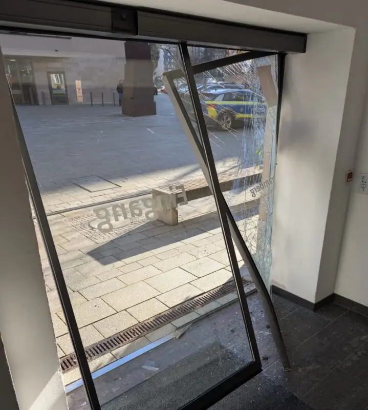 Es habe gegen 11.30 Uhr einen recht lauten Knall gegeben, so Stadtsprecher Hannes Herrmann. Die Höhe des Schadens an der Glastüre sei noch nicht bekannt. Mitarbeiter der Abteilung Hochbau hätten den Schaden aufgenommen und bemühten sich, dass die Türe so rasch als möglich wieder repariert werde.