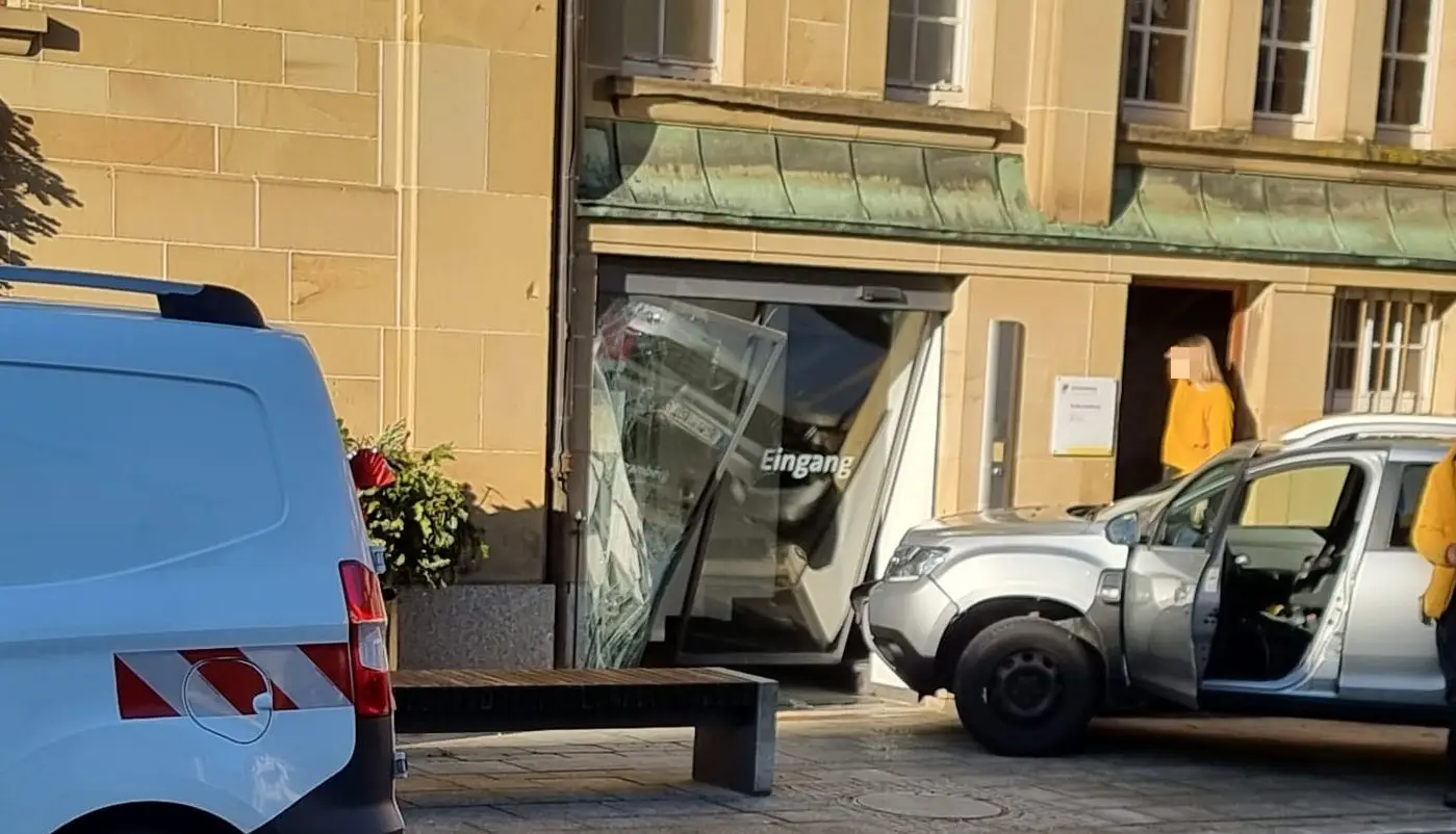 Ordentlich gescheppert hat es am späten Montagvormittags am Schramberger Rathaus. Ein Auto ist in die hintere Eingangstür des Rathauses gekracht. Verletzt wurde zum Glück niemand.