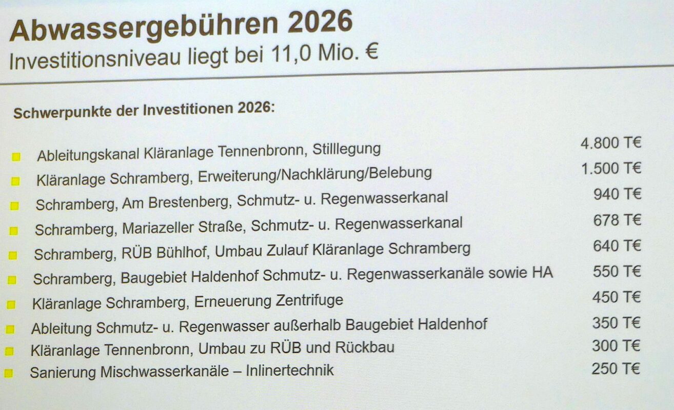 Außerdem seien im kommenden Jahr große Investitionen in Höhe von elf Millionen Euro geplant. Ziehe man die Zuschüsse ab, blieben immer noch 7,9 Millionen Euro. „Die hohe Investitionssumme geht auf die notwendige Erweiterung der Kläranlage Schramberg zurück, für die im Jahr 2030 die Genehmigung ausläuft“, schreibt Kälble in der Sitzungsvorlage.