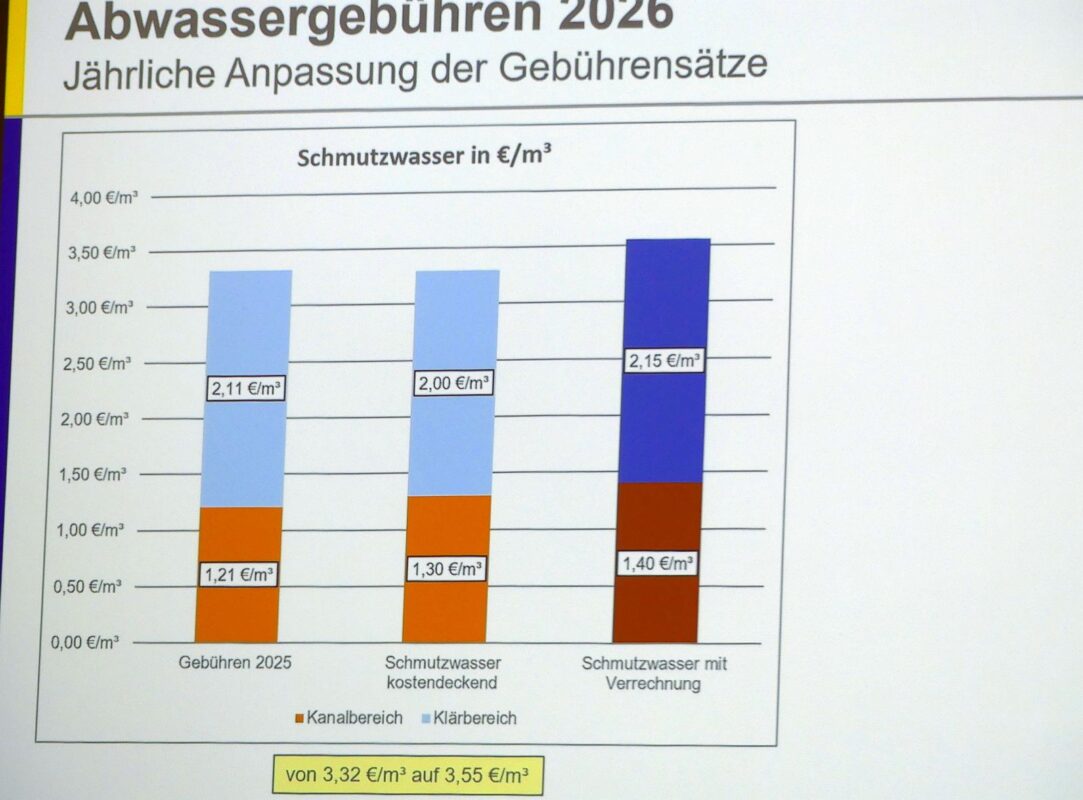 Bei der Neukalkulation kam das beauftragte Büro auf eine Niederschlagswassergebühr von 0,49 Euro pro Quadratmeter versiegelter Fläche, das sind vier Cent mehr also in diesem Jahr Die Schmutzwassergebühr steigt um 23 Cent auf 3,55 Euro pro Kubikmeter Abwasser.