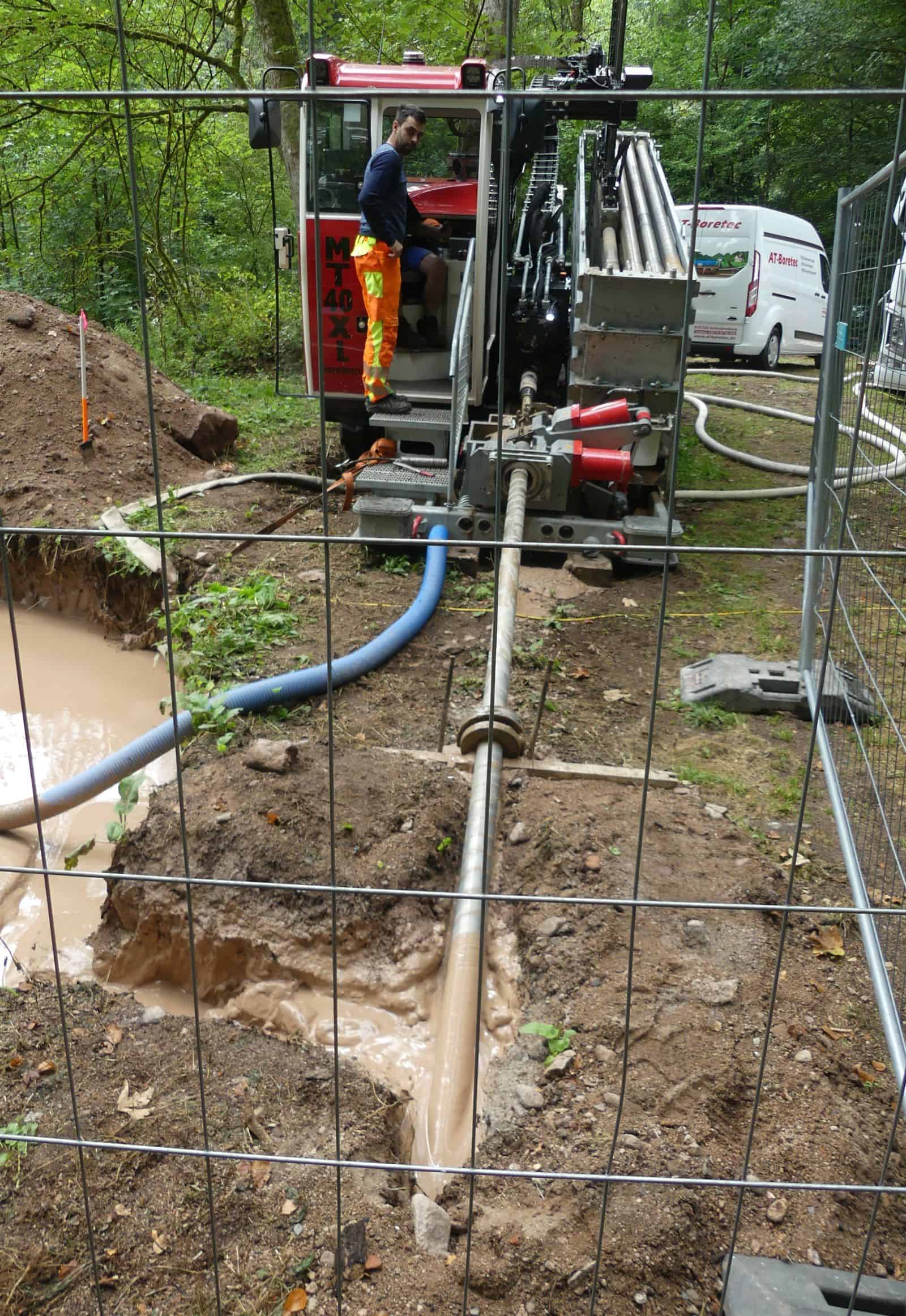 Die Bohrung verläuft teilweise 18 Meter unter der Oberfläche. Sie wird nun in zwei Etappen auf den endgültigen Durchmesser von 50 Zentimetern aufgeweitet. Später werde das Bohrloch verpresst. „Wir hoffen, dass es dann zu keinen weiteren Verschmutzungen kommt“, so Ginter. Da das Wasser nach unten abfließen kann, sei das aber auch eher unwahrscheinlich.