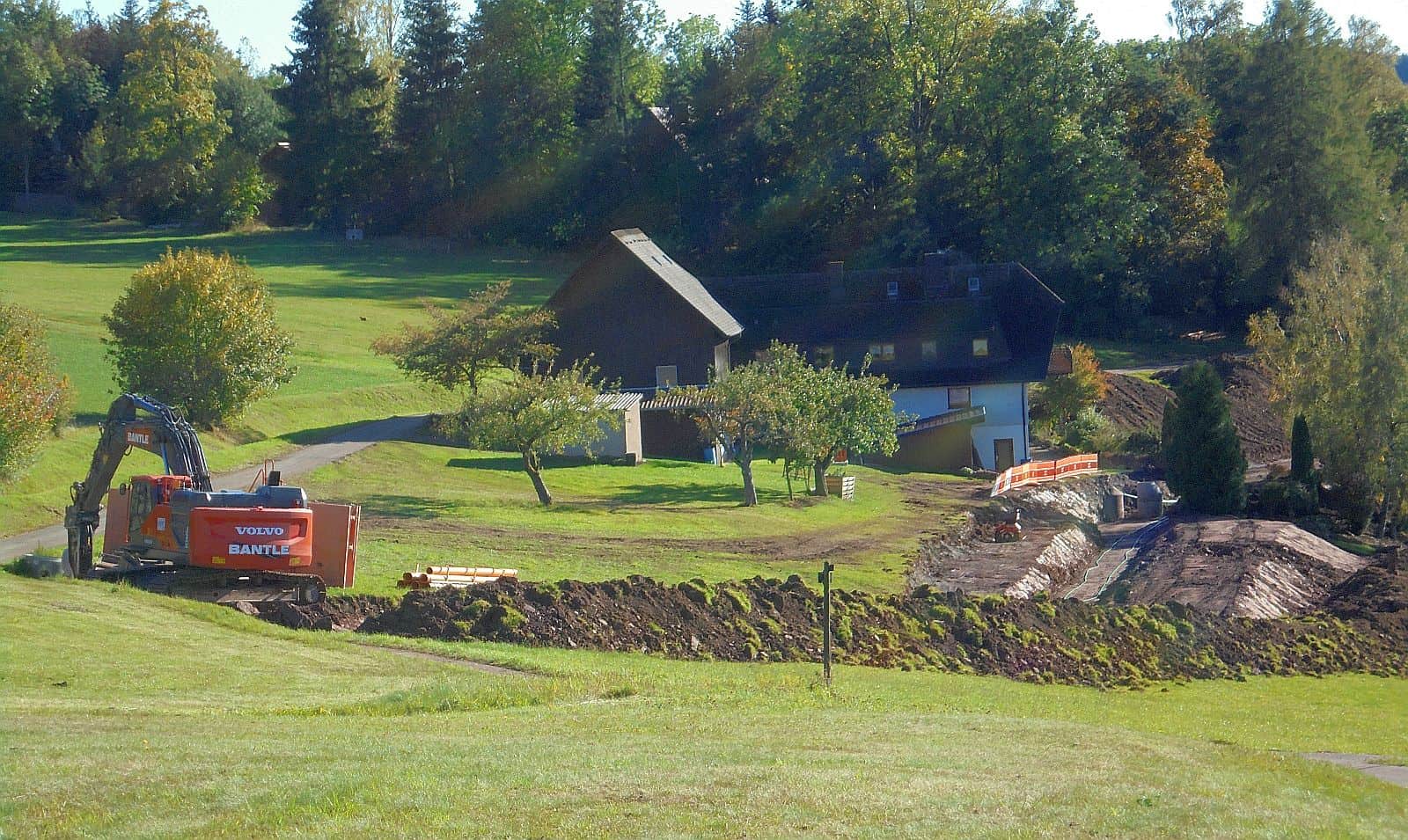 An der Oberfläche haben die Tiefbauer bereits in einigen Teilen der Hutneck die Gräben für die künftigen Abwasserrohre und Glasfaserleitungen ausgehoben und die Kanalrohre verlegt. Sobald die Rohre im Boden sind, schließen die Bauarbeiter die Gräben wieder und decken die sorgfältig abgehobene Humusschicht wieder oben drauf.