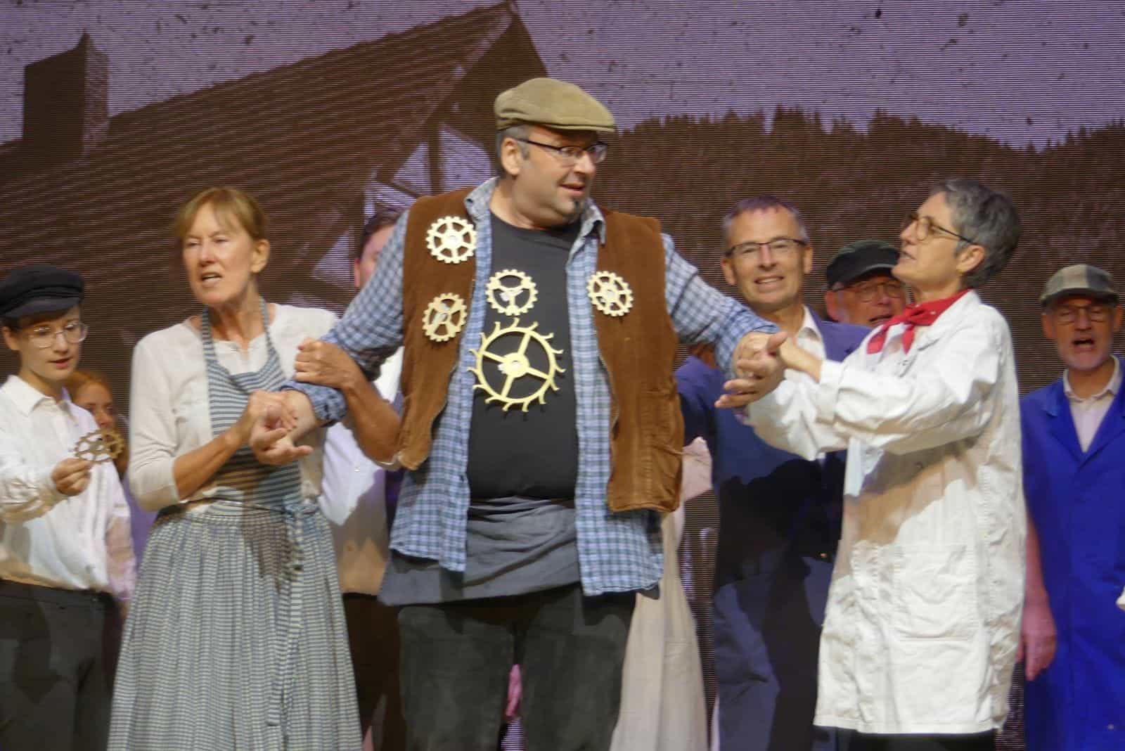 So begleiteten die Formationstänzer des Tanzstudios Dierstein den Heiratsantrag von Paul Landenberger mit einem schmissigen Walzer. Übermütig ärgerten „Dienstmädchen“ vom Tanzzentrum Arabesque die „Diener“ der Unternehmerfamilie. Urkomisch auch die Chöre vom Frohsinn und katholischer Kirchengemeinde bei der Akkordarbeit in der Uhrenfabrik.