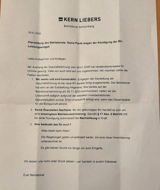 Gestern allerdings hat der Betriebsrat mit einem eigenen Aushang gekontert. Der Ausgang der Geschäftsleitung habe „verständlicherweise für Unruhe gesorgt“, heißt es da. Aber: „Keine Panik wegen der Kündigung der BV-Leistungsentgelt.“