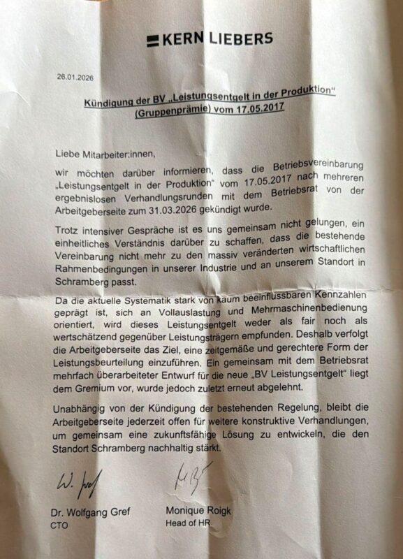 Schramberg. in einem Aushang haben am 26. Januar Wolfgang Gref, Chief Technology Officer (CTO) und für den Standort Schramberg federführend, und Personalchefin Monique Roigk den Mitarbeitern mitgeteilt, „dass die Betriebsvereinbarung ‚Leistungsentgelt in der Produktion‘ nach mehreren ergebnislosen Verhandlungsrunden mit dem Betriebsrat von der Arbeitgeberseite zum 31. März 2026 gekündigt wurde.“