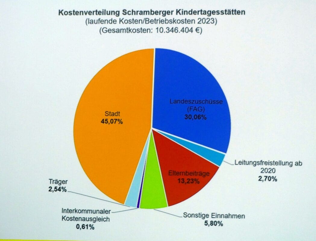 Die Betriebskosten für die Schramberger Kindertagesstätten lagen laut Flaig im Jahr 2023 bei etwa 10,3 Millionen Euro. Davon trug der Steuerzahler den Löwenanteil: Die Stadt 45 Prozent, das Land über einen Zuschuss 30 Prozent. Die Träger, also die beiden Kirchen und der Stiftung LFA, übernahmen 2,5 Prozent. Die Eltern zahlten etwa 13 Prozent.