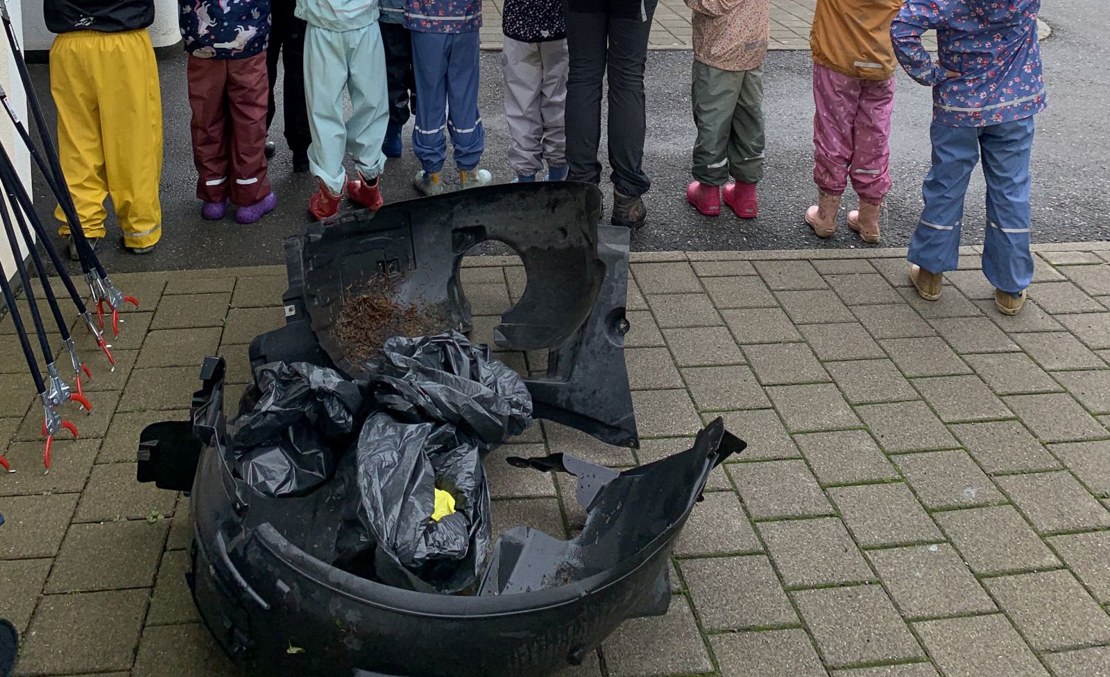 Und der Einsatz hat sich gelohnt: Neben zahlreichen Flaschen, Dosen und einer Unterhose entdeckten die kleinen Umweltschützer sogar riesige Plastikteile – vermutlich eines Komposts – im Gebüsch! Die Überraschung war groß und die Kinder sichtlich stolz auf ihre Entdeckung.