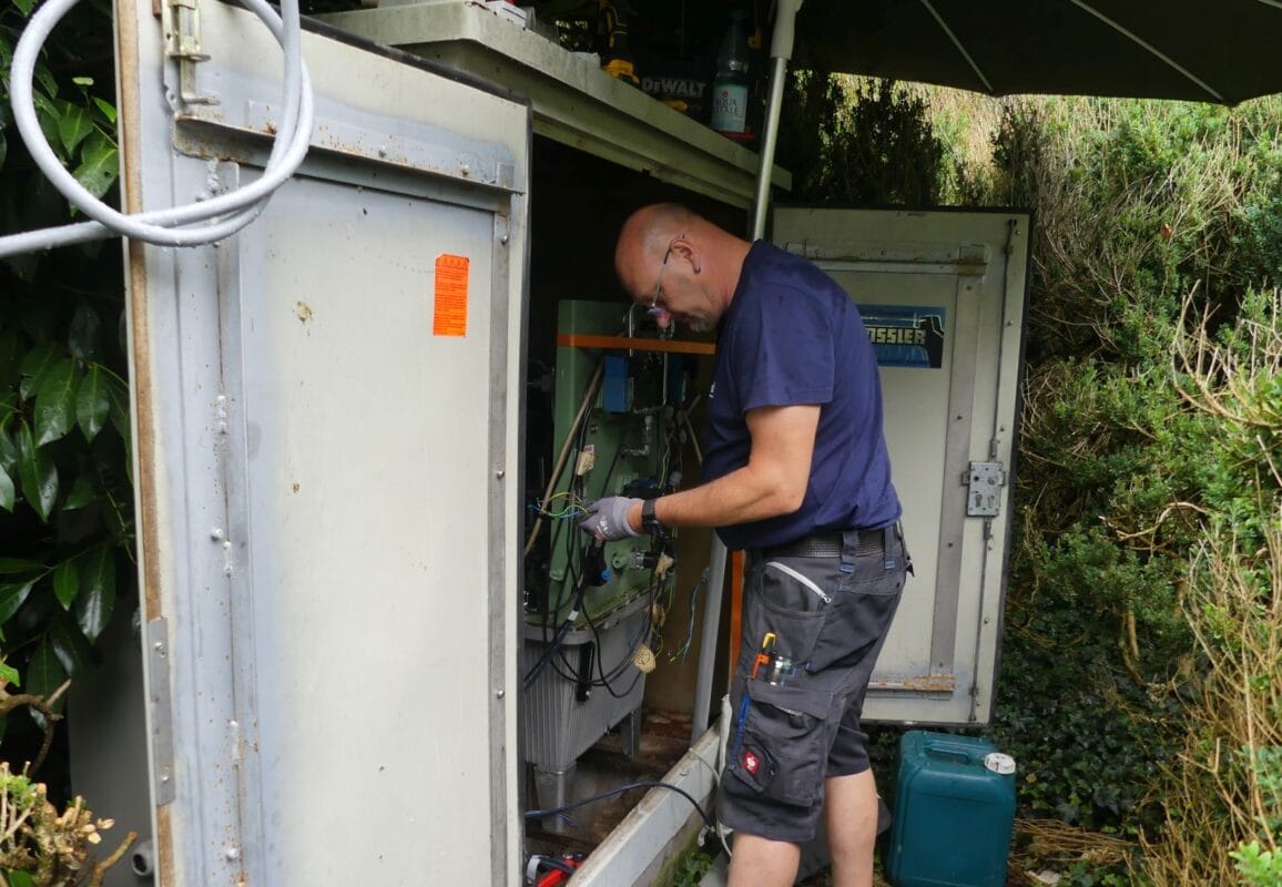 Sein Kollege ist derweil am Schaltschrank neben dem Fuß- und Radweg zu Gange. Die alte Schaltanlage haben die beiden bereits ausgebaut und durch eine nagelneue ersetzt. Statt der bisherigen Fühler wird eine neue Messtechnik dafür sorgen, dass der Wasserstand geregelt wird. „Die Steuerung ist später dann sogar per App auf dem Handy möglich“, berichtet er. Bisher musste man immer an den Schaltschrank kommen und „von Hand“ regeln.