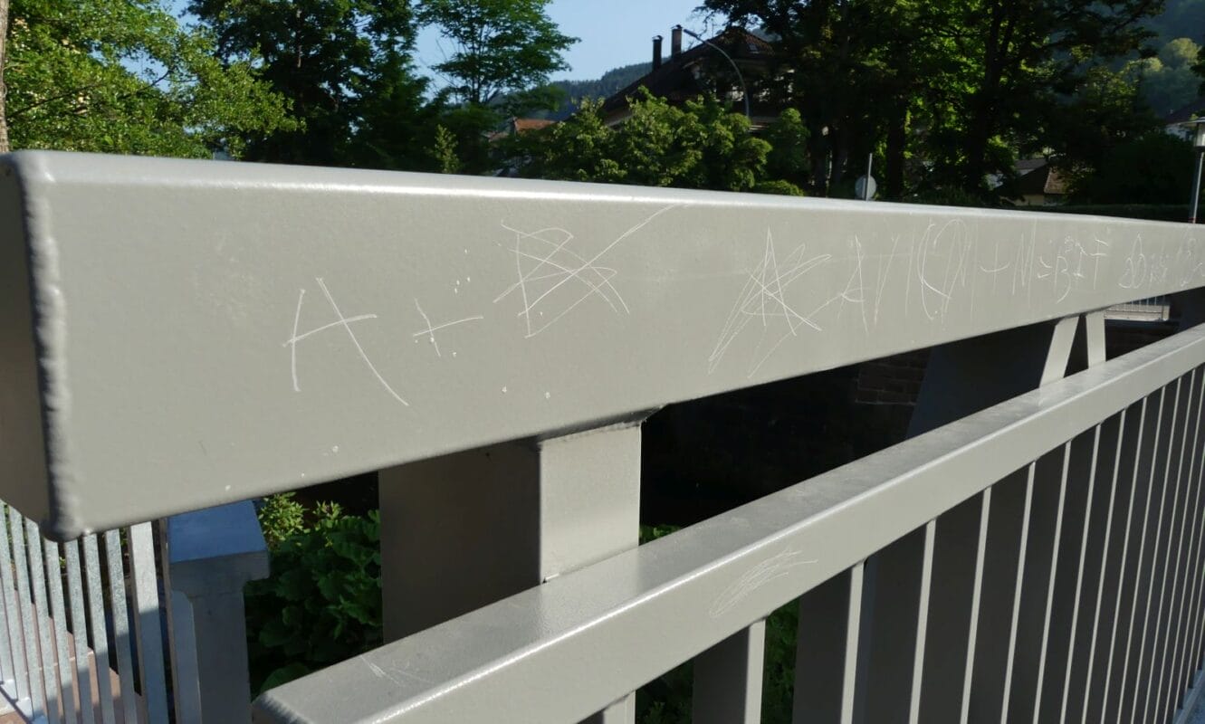 Dabei haben die Bauleute sehr unerfreuliche Vandalismus-Spuren entdeckt. Unbekannte Vollpfosten haben in die Geländer der wenige Wochen alten Brücke Buchstaben und Linien gekritzelt. Der Lack ist beschädigt. Würde man diese Schäden beseitigen, würde das einige tausend Euro kosten, ärgert sich Ginter, „Wir reden vom Sparen…“