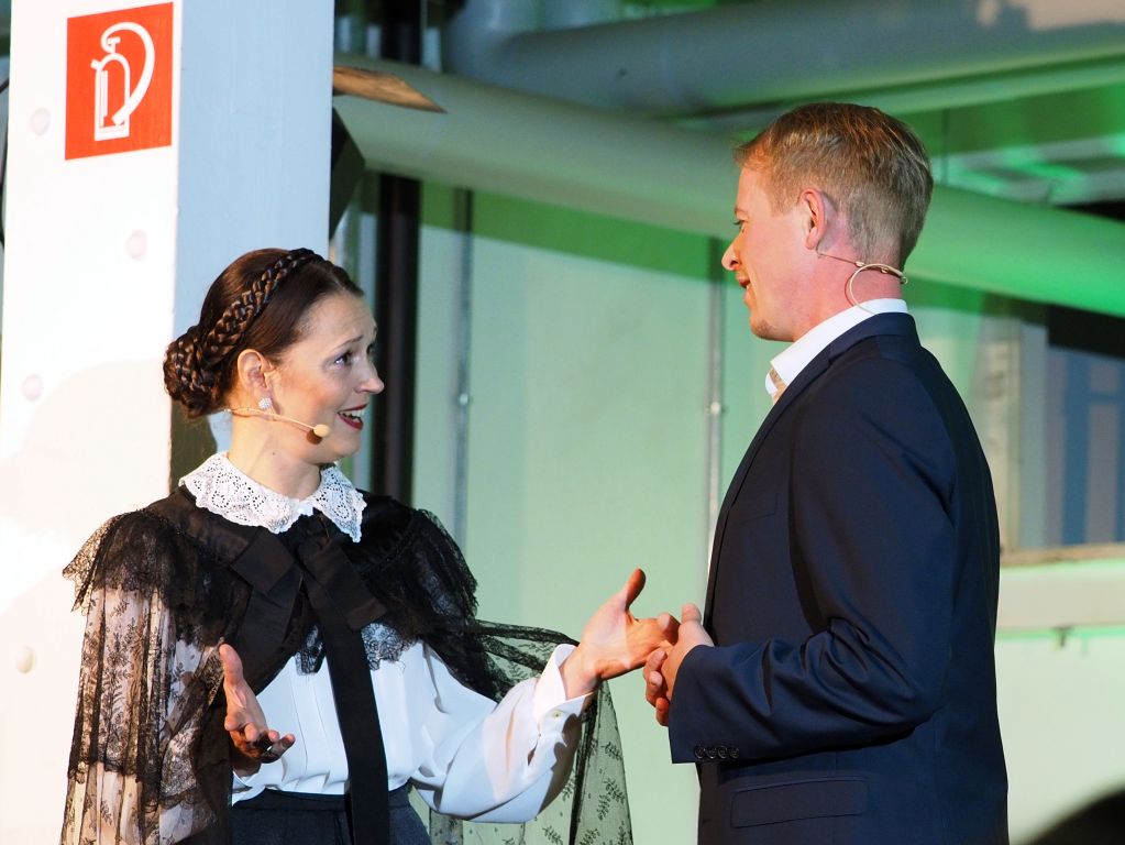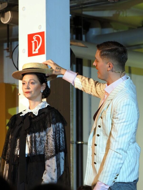Oberbürgermeisterin Dorothee Eisenlohr begrüßte die anwesenden Gäste zu einem „Großen Highlight.“ Sie lobte das Engagement der rund 150 Beteiligten beim Musicalerfolg vor zwei Jahren im Bärensaal. Dass das Musical ein „voller Erfolg“ war, bewies auch ein kurzer Auftritt in der Landesschau des Südwestdeutschen Rundfunks. Passend zum Jubiläum werde die Aufführung in einem „Gebäude der Hamburg-Amerikanischen Uhrenfabrik“ präsentiert. Die „gute Idee“ stamme von Fachbereichsleiterin Susanne Gwosch, so Eisenlohr weiter. Alt bewährt hat Meinrad Löffler „wieder die künstlerische Verantwortung übernommen.“ Großen Dank sprach Eisenlohr im Vorfeld Martin Sauter aus, der das Projekt finanziell unterstützte. Zurück zum Geschehen auf der Bühne: