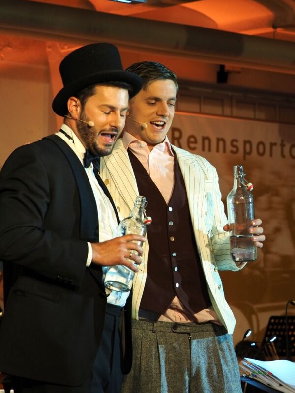 Unter tosendem Applaus gab das Sänger-Quintett eine kurze Zugabe des goldenen Finales. Anschließend bejubelte das Publikum die einzelnen Darsteller und Darstellerinnen. Auch die Autoren des Textes, Roland Eisele und Lars Bornschein, die den Abend als ältere Uhrenbarone Junghans und Landenberger bereicherten, sowie Meinrad Löffler als musikalischem Leiter des Orchesters erhielten ein kleines Dankeschön.