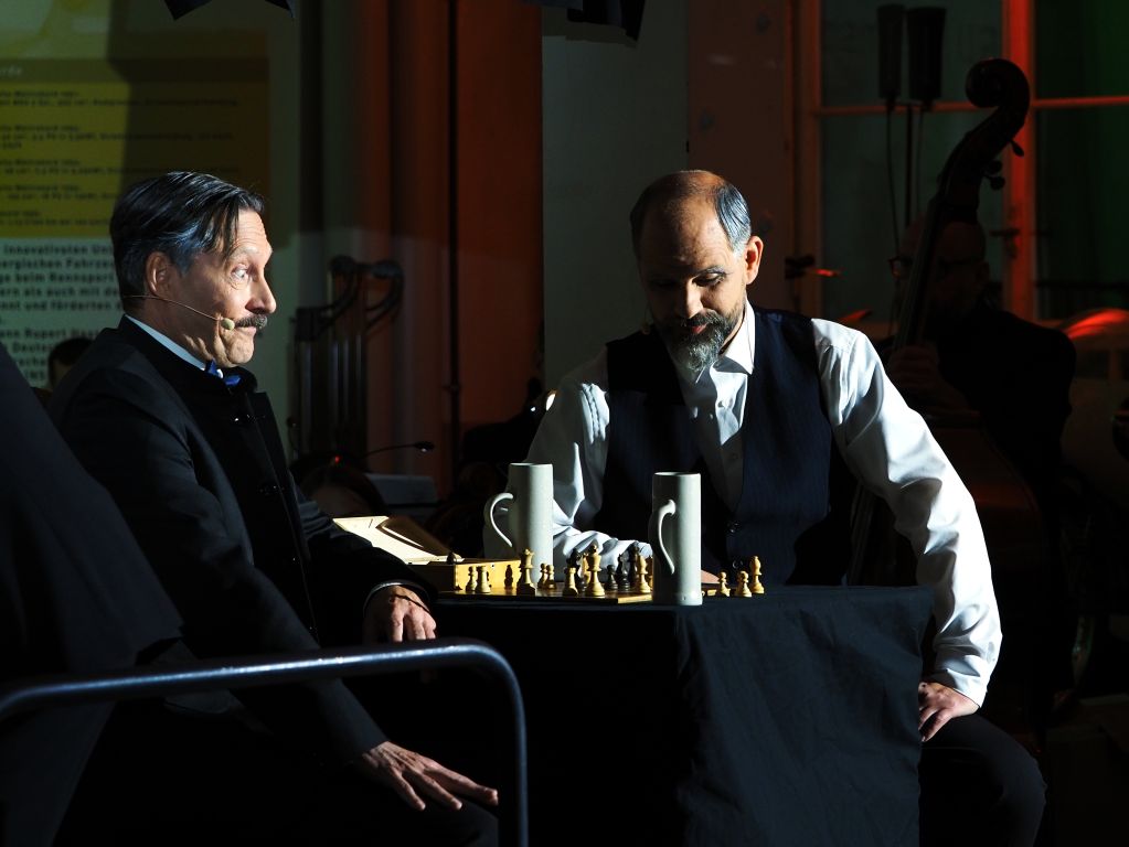 Nachdem Paradieswirt „Günter“ dem werten Herrn Junghans ein Bier servierte, begannen die beiden Firmenchefs eine Partie Schach zu spielen. An Gesprächsthemen ging es nicht aus und so begann Paul Landenberger vom unerwarteten Tod des seligen Firmengründers Erhard Junghans zu sprechen. Diesen durfte er der Belegschaft mitteilen, während Arthur Junghans (gespielt von Dominik Dieterle) im Felde gegen die Franzosen kämpfte.