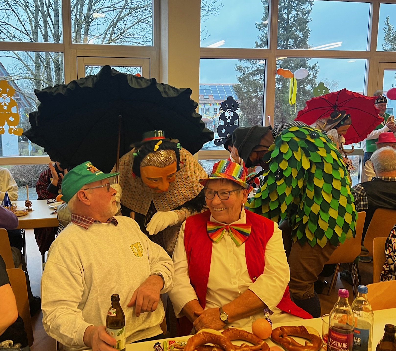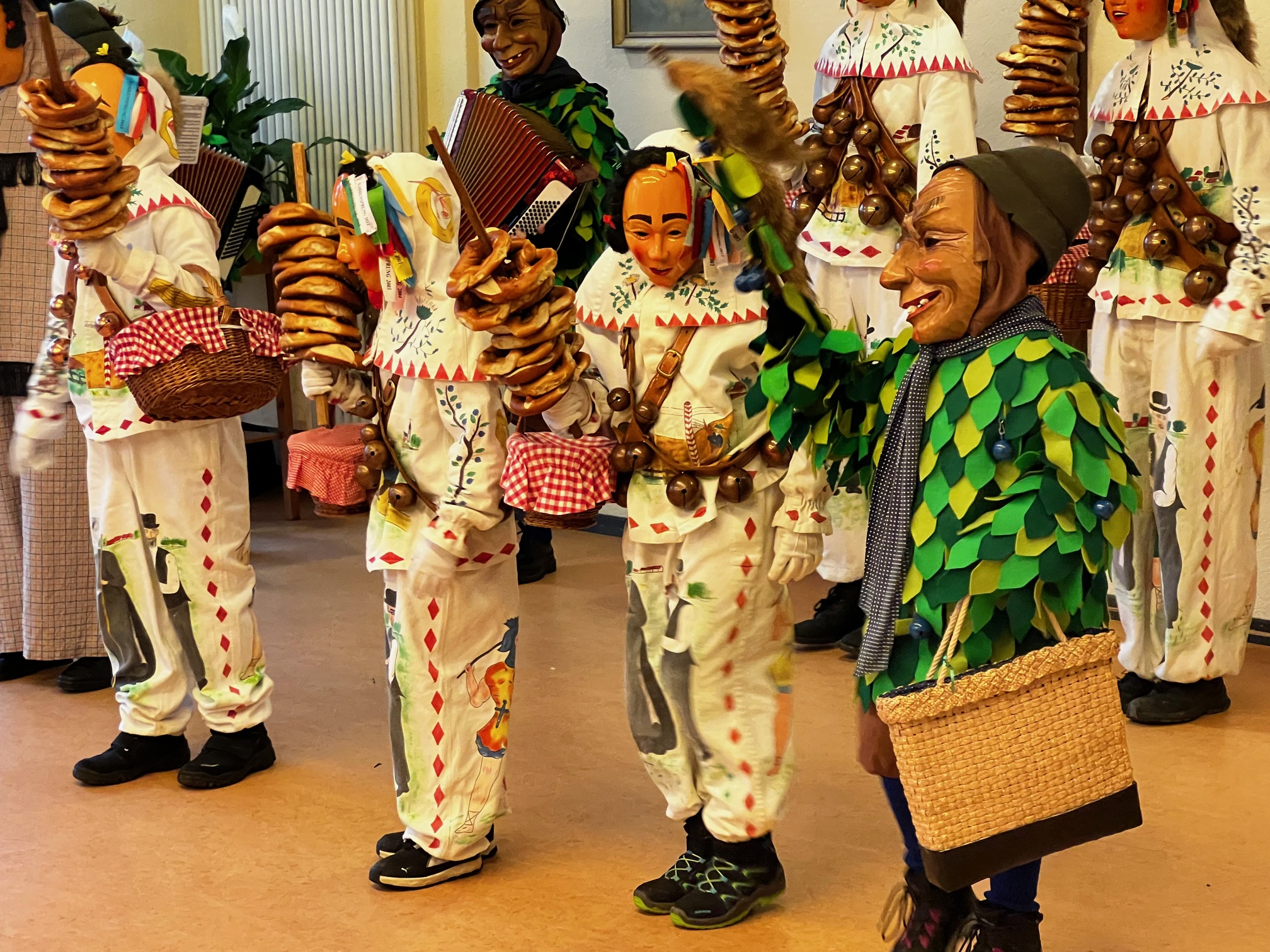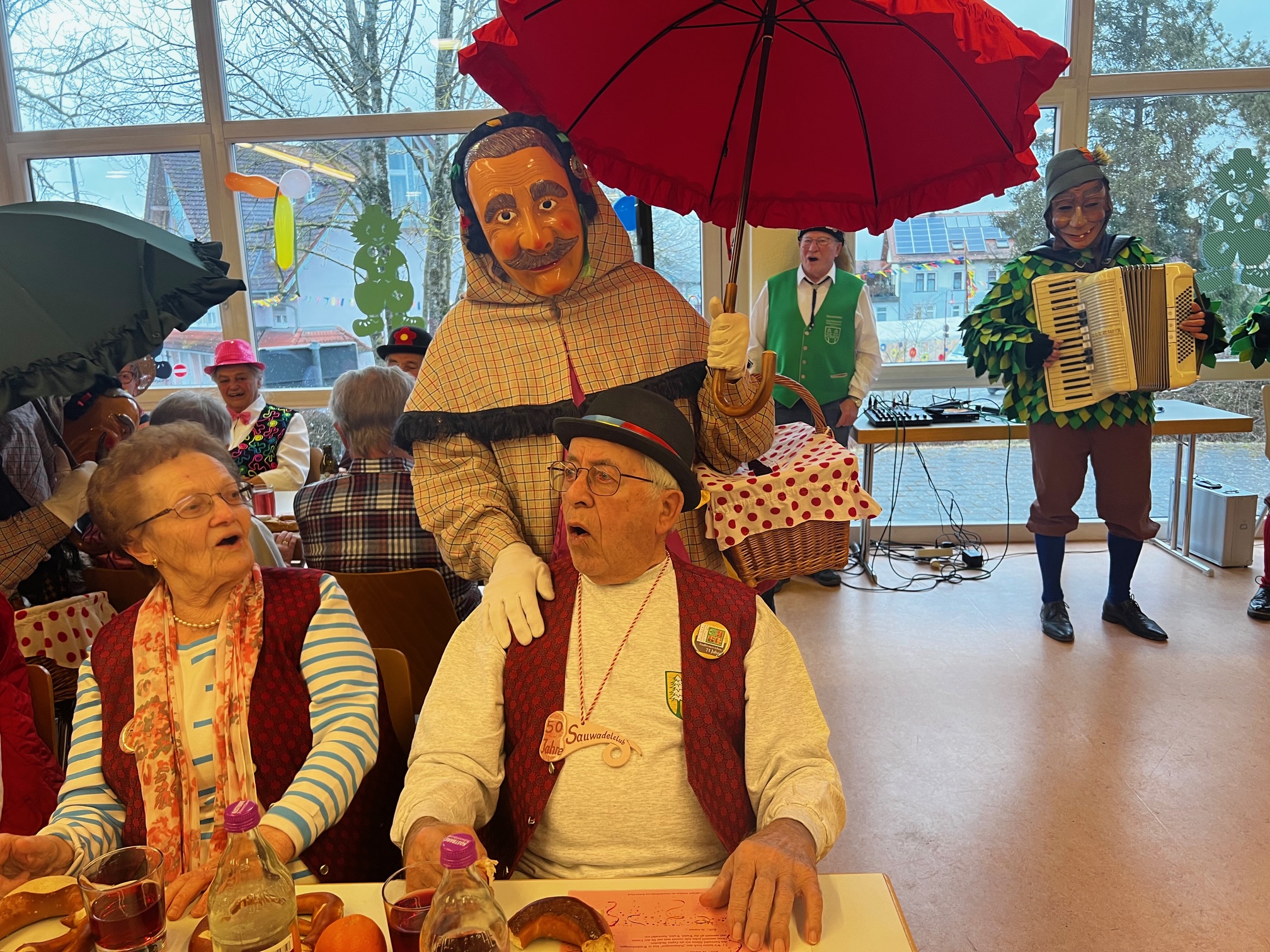 Besonders stimmungsvoll wurde es beim Einmarsch einer kleinen Besetzung der Jockele-Kapelle des Akkordeonorchesters. Begleitet von Narrenfiguren verteilten die Akteure Brezeln, Orangen und Süßigkeiten an die Seniorinnen und Senioren – zur sichtlichen Freude der Gäste.
