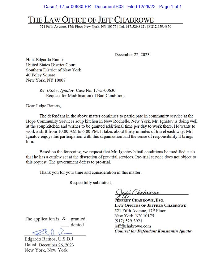 Laut Anwalt Jeffrey Chabrowe nimmt Konstantin an einem Gemeinschaftsprojekt einer gemeinnützigen Organisation in New Rochelle, ein paar Meilen nördlich der Bronx teil. „Mr. Ignatov ist doing well at the soup kitchen“, schreibt Chabrowe an Richter Edgardo Ramos und bittet ihn deshalb, Ignatov zu erlauben, dort länger arbeiten zu dürfen.