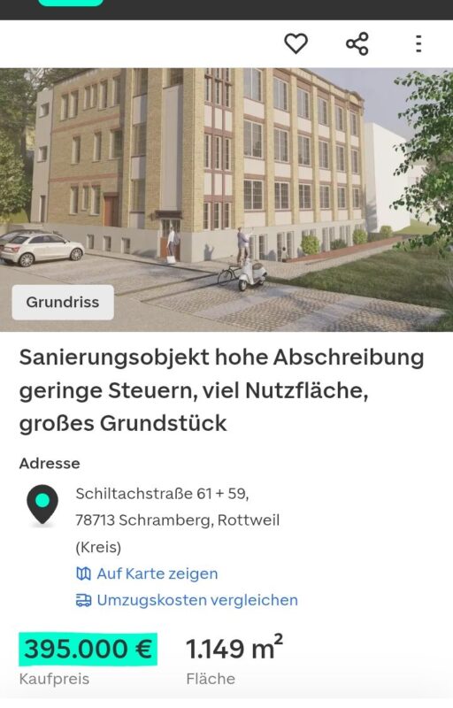 Schramberg. Auf einer einschlägigen Immobilienseite wird das Gebäude zum Preis von 395.000 Euro als „Sanierungsobjekt“ angeboten.