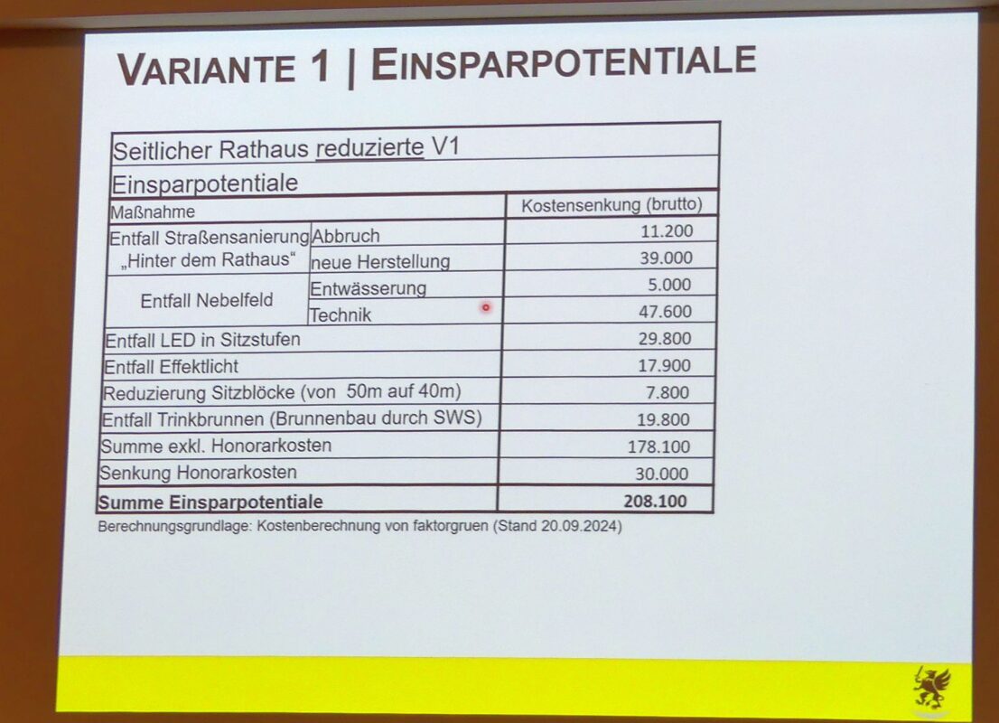 Die Stadtplanung habe deshalb die ursprüngliche Variante 1 nochmals überarbeitet (siehe hier), etliche Details weggelassen und komme nun auf etwa 500.000 Euro Kosten. Günstigstenfalls erhalte die Stadt dafür einen Landeszuschuss in Höhe von 300.000 Euro, schlimmstenfalls nur knapp 100.000 Euro.