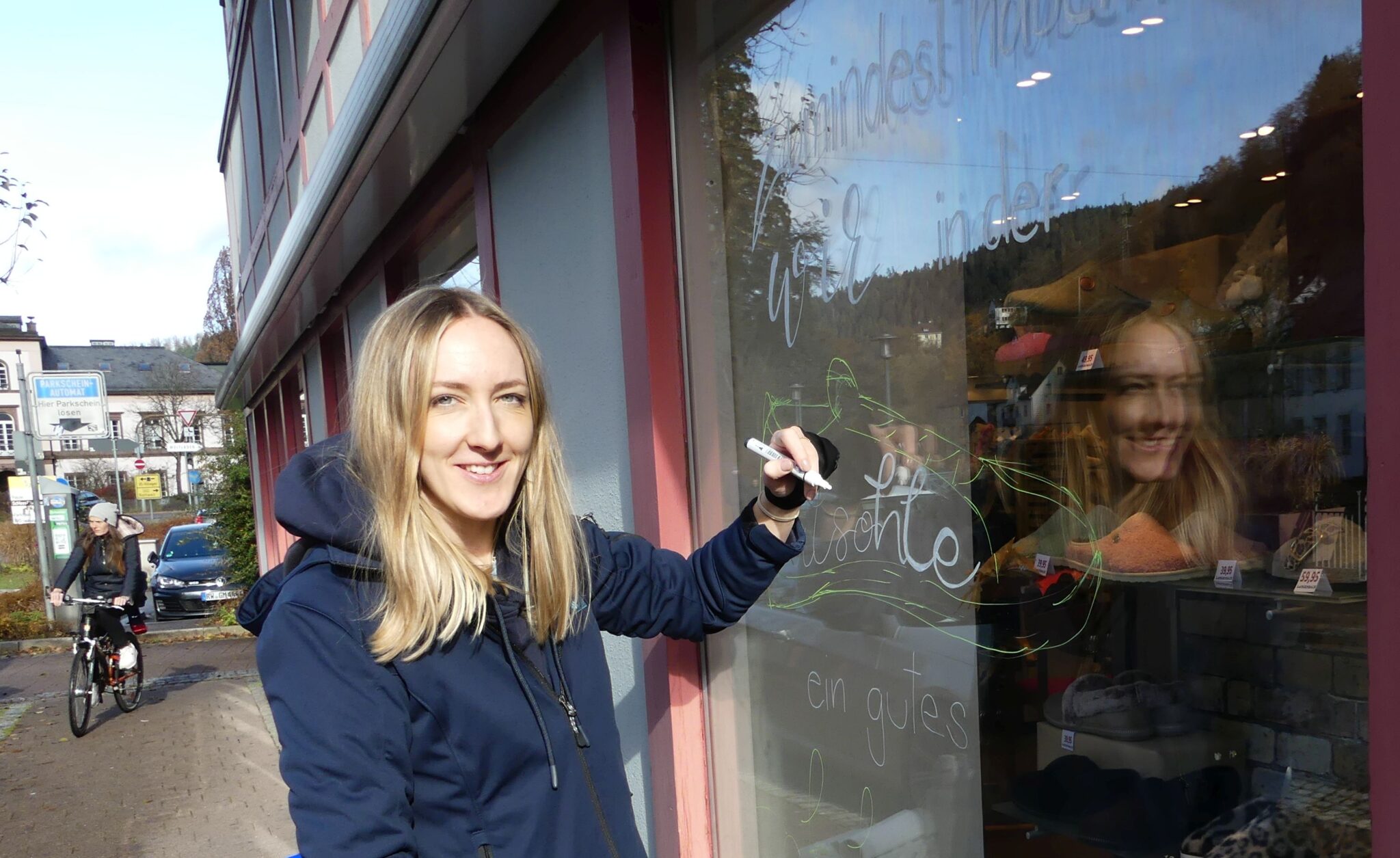 „Zumindest haben wir in der Talsohle ein gutes Schuhgeschäft“. So steht es seit heute an einem Schaufenster in der Hauptstraße. Carina Schmid hat es mit weißer Spezialfarbe auf Glas geschrieben. „Erfunden“ hat den mehrdeutigen Satz Lars Bornschein.