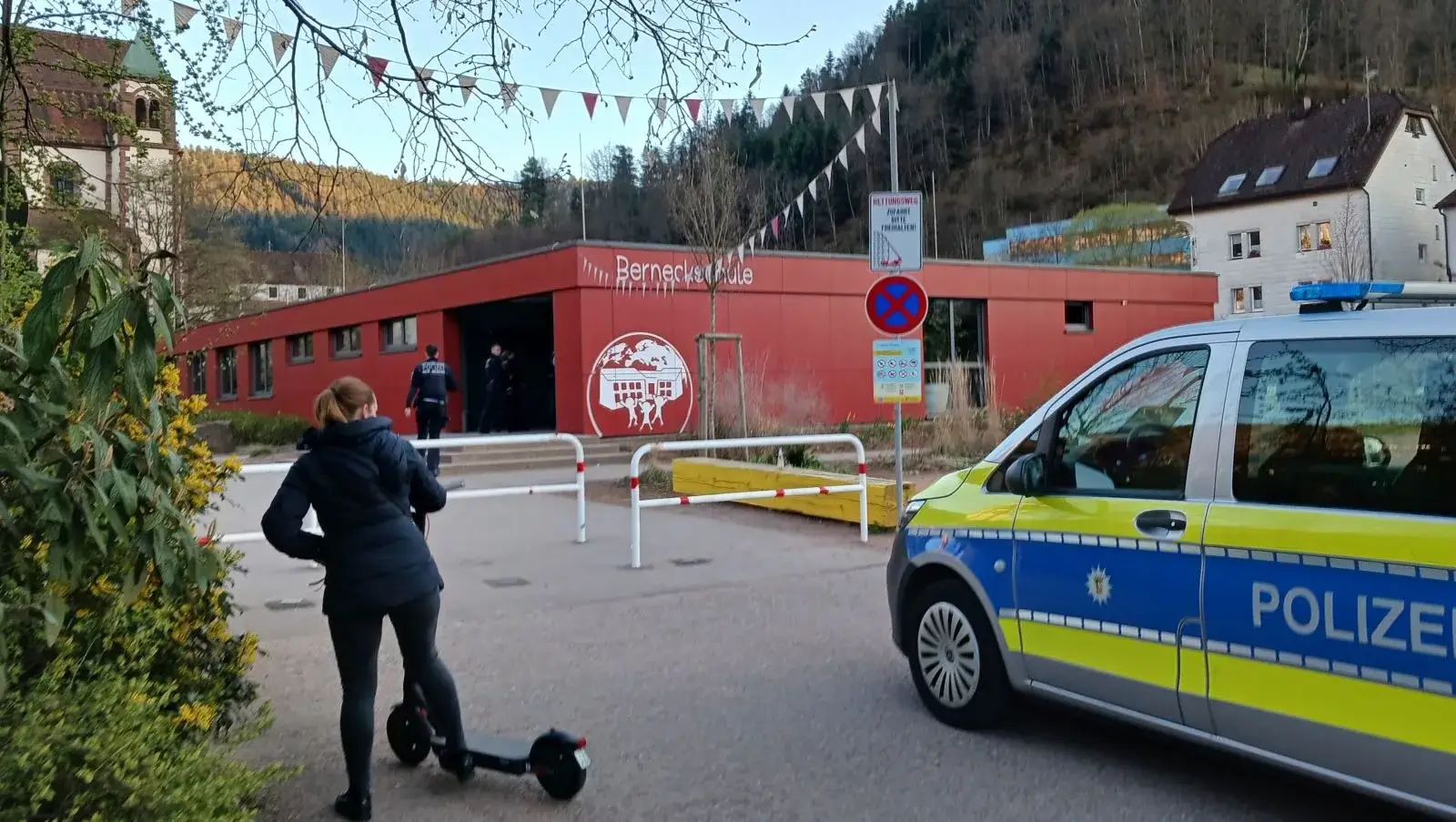 Kurz darauf stoppten sie auf dem Schweizerparkplatz, stürmten zum Eingang der Berneckschule und stellten dort eine Person. Wenig später kamen weitere drei Streifenwagen, sowie ein Polizeihundeführer herbeigeeilt und liefen auch zum Eingangsbereich der Behelfsklassenzimmer.