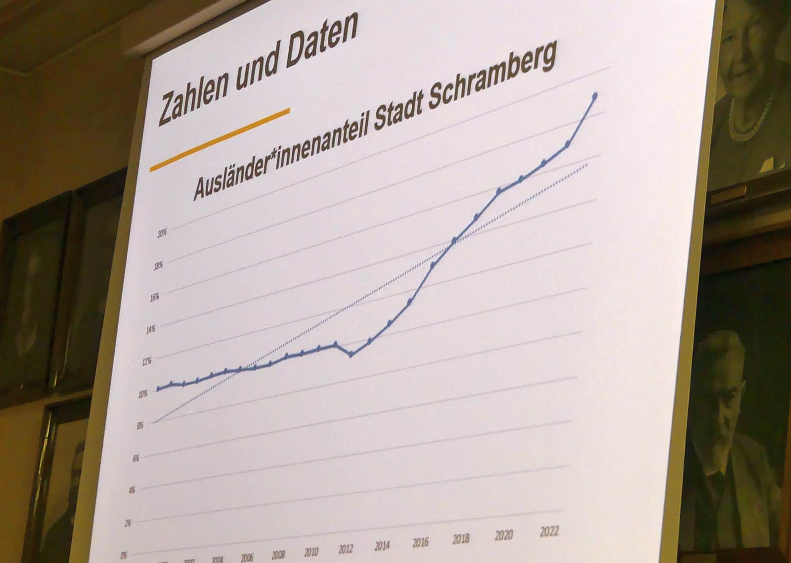 Lag der Anteil der Ausländer von 1998 bis 2012 konstant bei zehn Prozent, ist er bis 2022 auf nunmehr fast 19 Prozent gestiegen. Ende des Jahres lebten 4062 Personen in Schramberg, die keine deutsche Staatsbürgerschaft besitzen. „Die EU-Erweiterung sei „der maßgebliche Punkt“ für den starken Anstieg gewesen, so Dreyer.