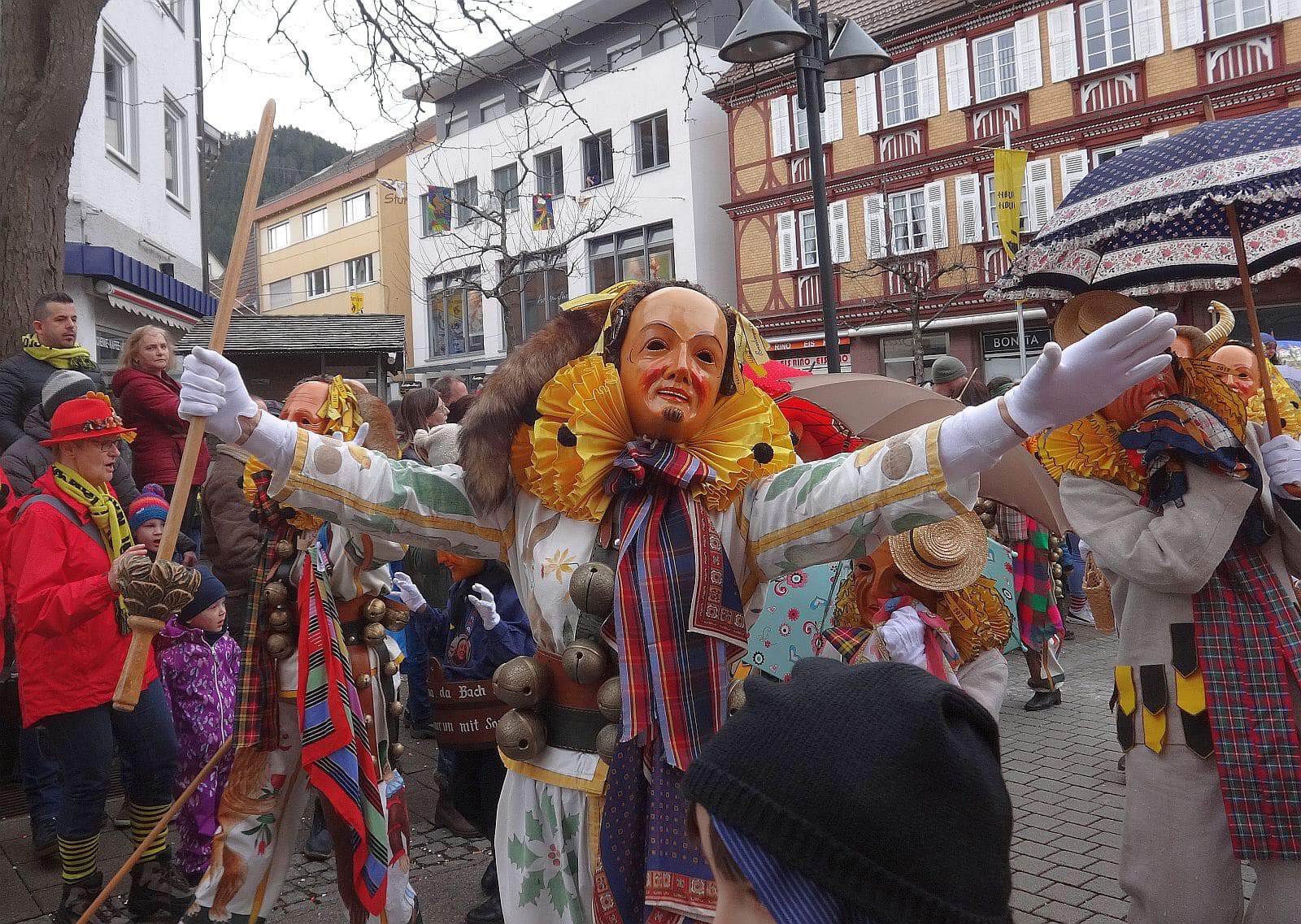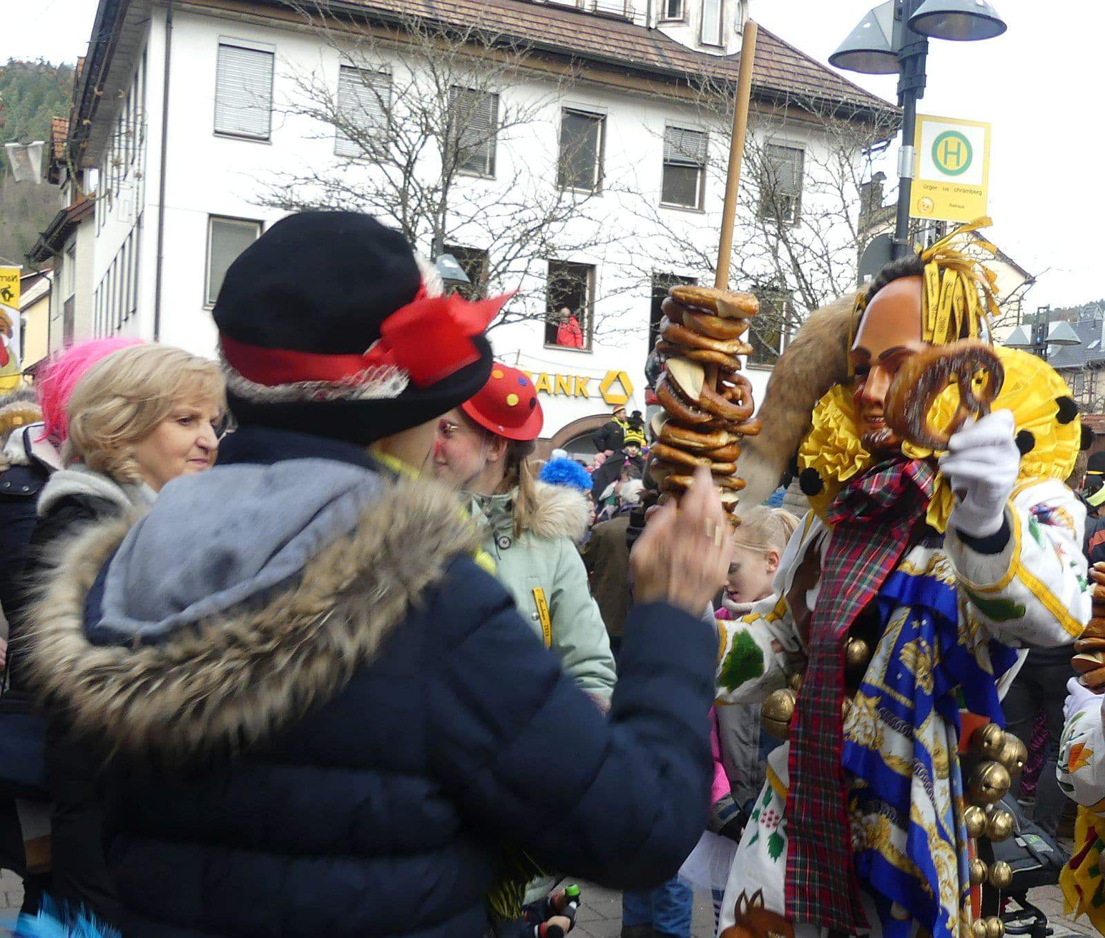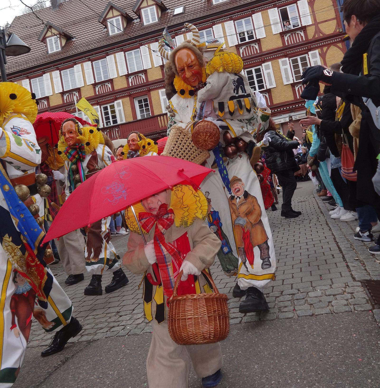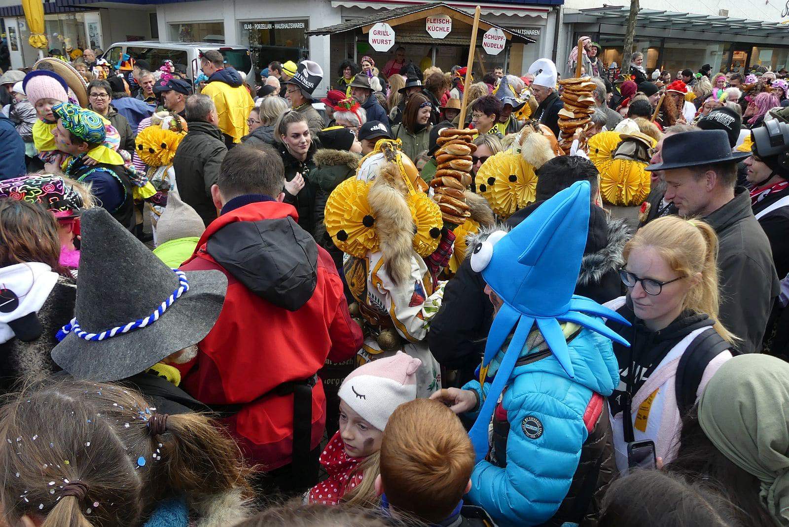 Dann ging es hinaus zum wie immer auf die Straßen mit den bunt kostümierten Zuschauerinnen und Zuschauern, die sangen, sprangen und tanzten, und die Narren um Brezeln, Würstle und Schoklädle anbettelte: „Hoorig, hoorig isch dia Katz…“