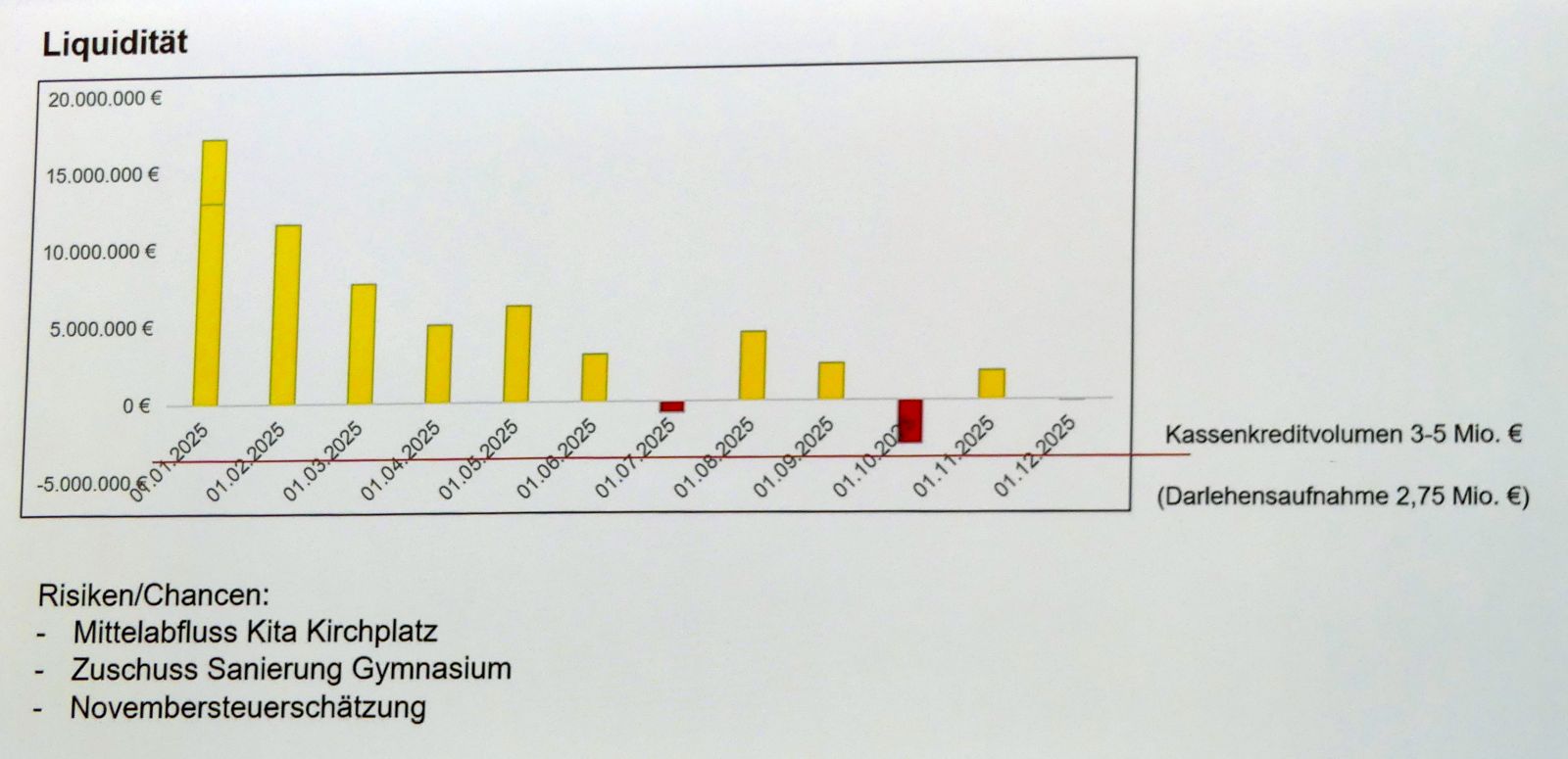 Die Vorauszahlungen für 2026 blieben jedoch unverändert, so Walter das sei immerhin „ein kleiner Lichtblick“. Bei der Liquidität sei die Stadt zwei Mal ins Minus gerutscht“ und musste für die Kirchplatzschule einen Kredit in Höhe von 2,7 Millionen Euro aufnehmen.