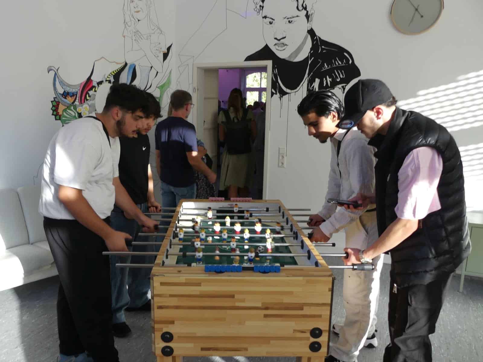 Geht man durch Erdgeschoss, so findet man linker Hand eine geräumige Küche mit allem Drum und Dran. Daneben befindet sich ein großer Raum, den man über eine Trennwand in zwei Zimmer aufteilen kann. Vorne im Eck ist das Spielzimmer mit einem Tischkicker und einem großen Fernsehbildschirm: „Den hatte den städtische IT-Abteilung ausgemustert“, verrät Dreyer. Auf dem Sofa sitzen ein paar Jungs und schauen sich ein Fußballspiel aus der italienischen Liga an. Vier andere traktieren die Spieler am Tischfußball.