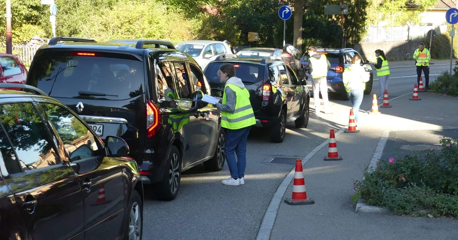 Schramberg. An der Ecke Kirnbachstraße/Berneckstraße haben sich etwa ein halbes Dutzend Gymnasiastinnen und Gymnasiasten postiert. Ebenfalls dabei ist eine Polizeibeamtin, alle in gelben Warnwesten. Die Polizistin hält die Hand hoch und stoppt ein Auto. Ein Schüler geht zur Beifahrertür. „Darf ich Sie etwas fragen?“ Die Autofahrerin hat nichts dagegen.