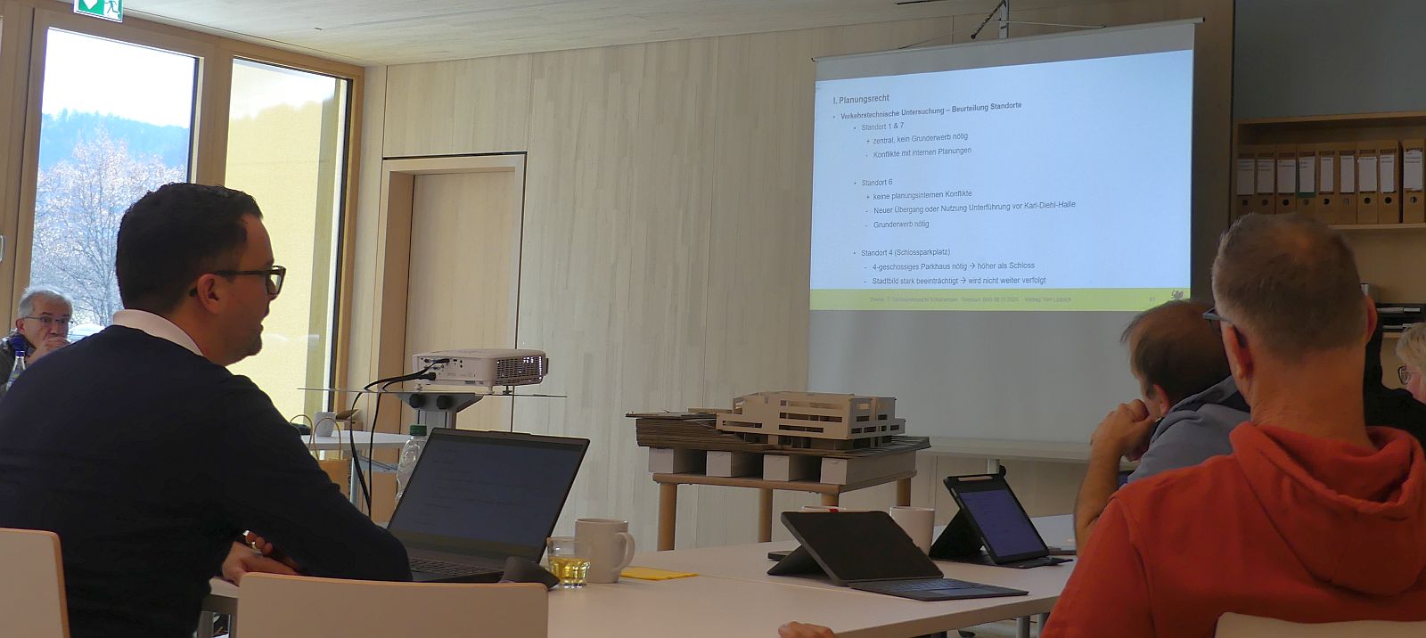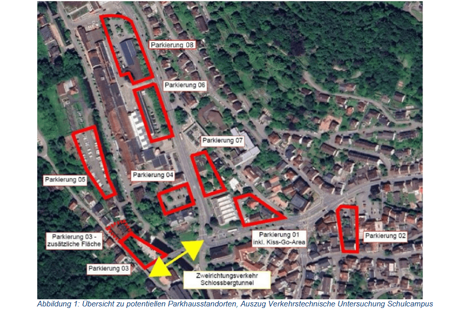 Der Parkplatz beim Schloss scheide als Fläche für ein Parkhaus aus städtebaulichen Gründen aus. Der Platz beim Bettenhaus Alesi ginge nur mit einer teuren Überführung und sei deshalb nicht möglich. Es blieben ein Platz an der Stelle des heutigen JUKS-Gebäudes oder einer an der Stelle des alten Don-Bosco Kindergartens.