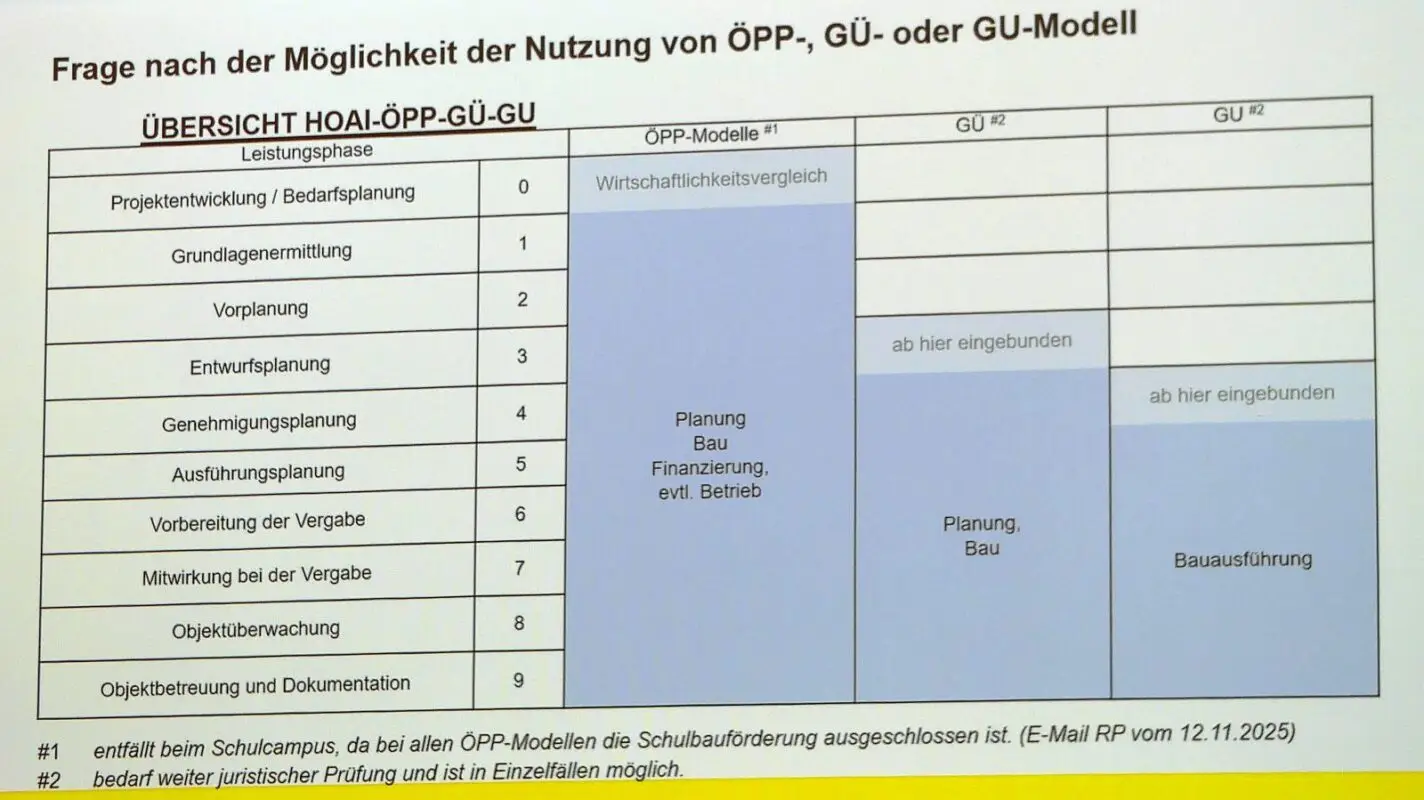 Zum Thema alternative Finanzierungsmöglichkeiten, über die der besondere Ausschuss nichtöffentlich beraten hatte, berichtete Müller, dass die Modelle mit einer öffentlich-privaten Partnerschaft oder einem General- Übernehmer nicht förderfähig wären oder juristische Probleme brächten. In Frage käme, dass die Stadt einen Generalunternehmer beauftragt.