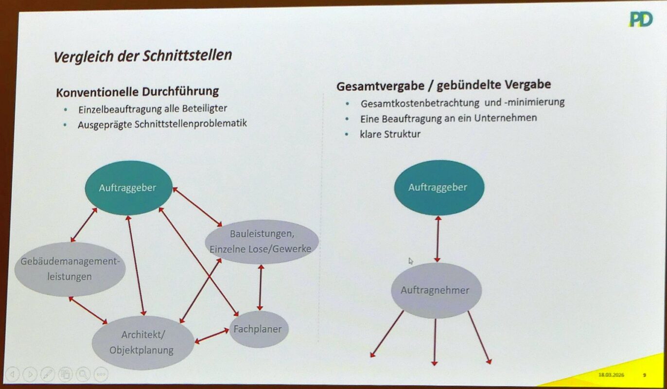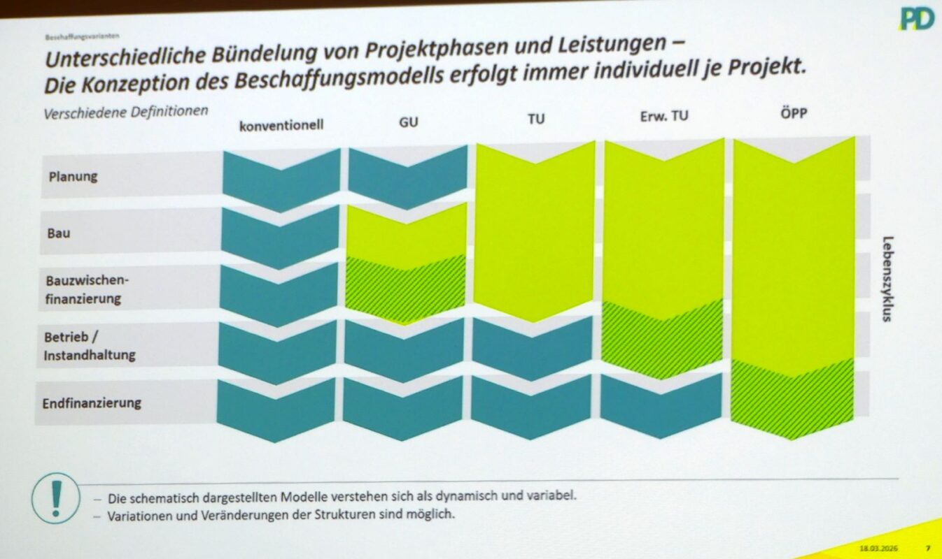 Weil auch die Planung schon weit fortgeschritten sei, komme das Modell „Totalübernehmer“ ebenfalls nicht in Frage. Es bliebe das Modell Generalunternehmer, bei dem eine Firma die Planung übernimmt und den Bau dann in Eigenregie umsetzt. Beim Generalübernehmer müsste dieser stärker in den Planungsprozess eingebunden sein.