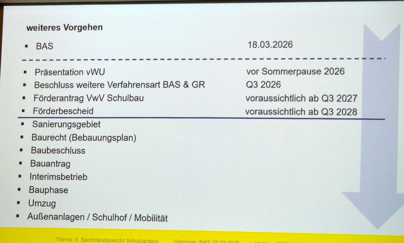 Zum Zeitplan führte Müller aus, dass nach der vorläufigen Wirtschaftlichkeitsuntersuchung bis Sommer die Entscheidung zu einem Generalunternehmer oder zur Einzelvergabe fallen könne. Dann werde die Stadt im dritten Quartal 2027 den Förderantrag stellen, der bis zu selbigem Zeitpunkt im Jahr 2028 beschieden sein sollte. Danach kämen der Antrag auf ein Sanierungsgebiet, die Verabschiedung eines Bebauungsplans, der Baubeschluss und ein Bauantrag … Alles noch in weiter Ferne.