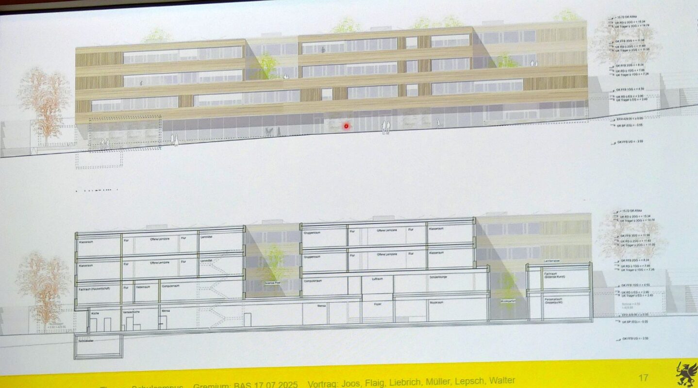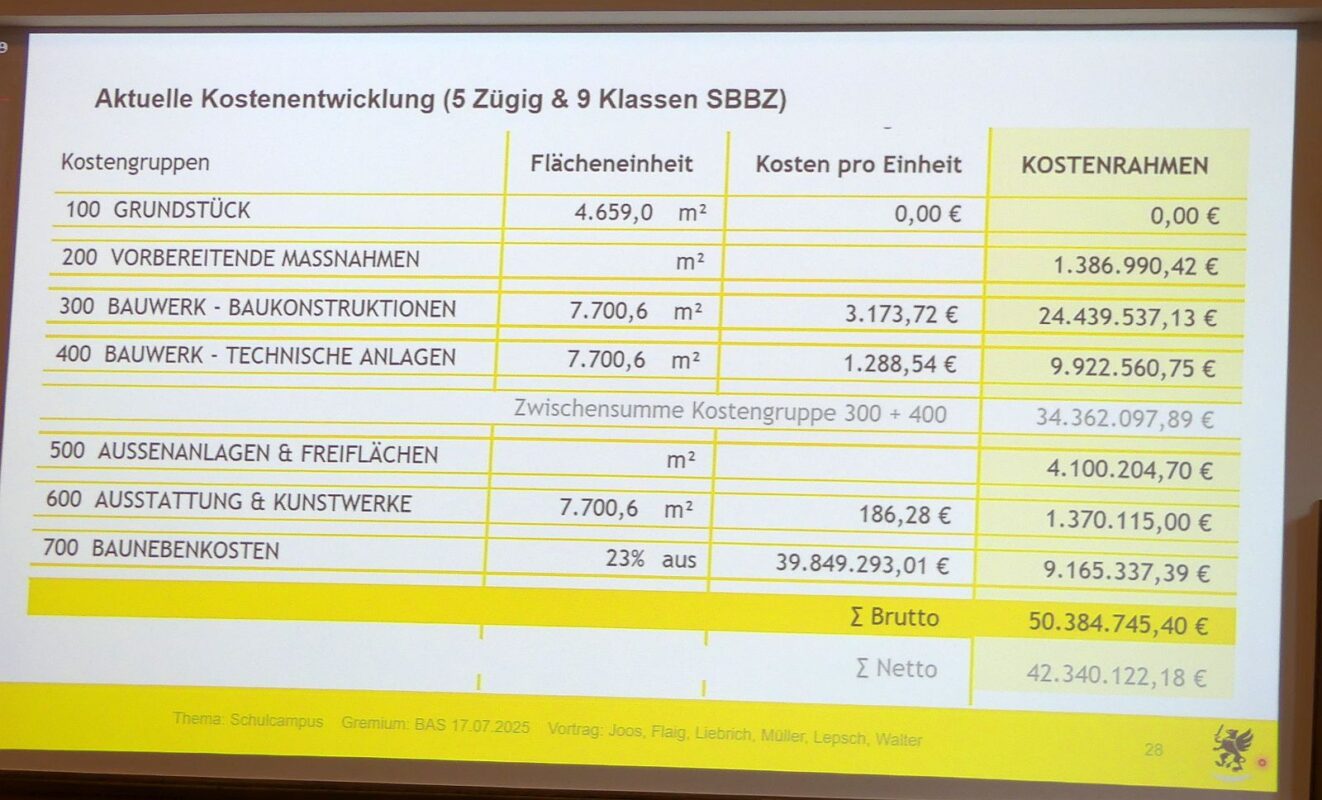Thomas Müller von der Abteilung Hochbau nannte die aktuellen Zahlen: Für die nun etwas vergrößerte Schule kam er auf 50,4 Millionen Euro. Dafür hatte er die Zahlen von 2023 hochgerechnet. Er hat aber auch die Kosten für die Sanierung der alten Schulen neu berechnet und kam auf 59,9 Millionen Euro. „Dann hätten wir aber nur die alten Gebäude.“