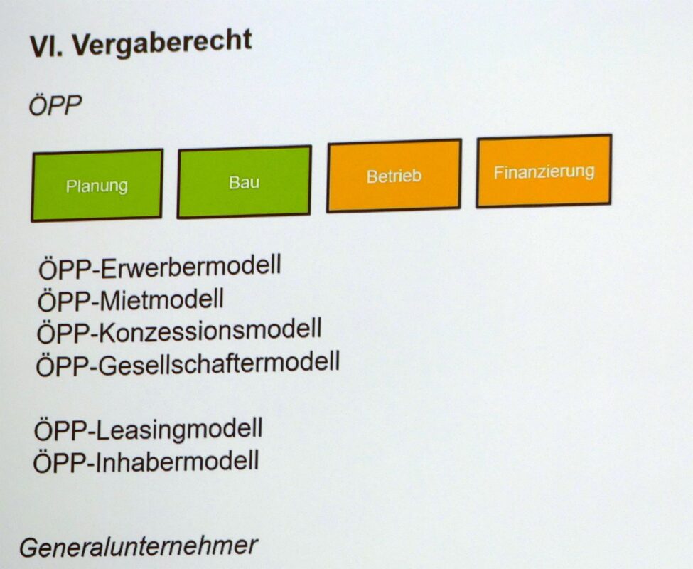Bei solchen Projekten gehe es um vier Module: „Planung“, Bau“, „Betrieb“ und „Finanzierung“. Üblicherweise übernehme man mindestens Planung und Bau in eine solche Partnerschaft. Wie es hinterher weitergehe, könne man auch unterschiedlich gestalten: Stadt wird Eigentümer, Stadt mietet das Gebäude oder die Stadt least es und kauft nach Ablauf zum Restwert.