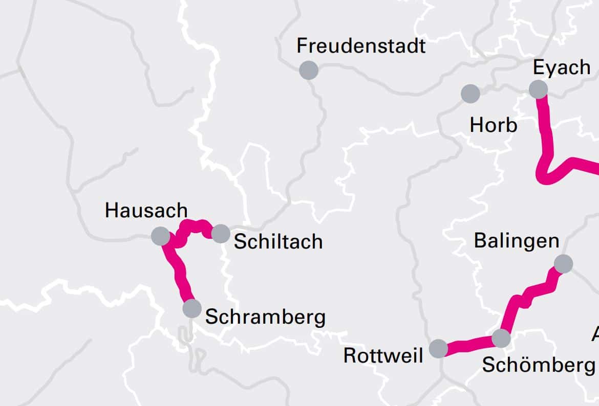 Betrachtet man nun die vom Landesverkehrsministerium vorgelegte Übersichtskarte zu den Bahnprojekten, kommen dem Betrachter auch hier Zweifel an der Kompetenz der Beteiligten. Statt die tatsächliche Verbindung Schiltach – Schramberg zu markieren, zeichnen sie eine Strecke, die von Schiltach über Hausach nach Schramberg führt.